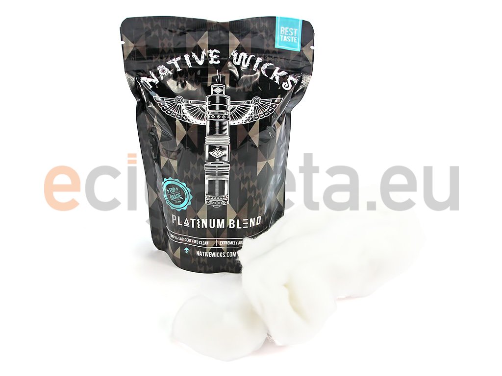 Absorpční vata Native Wicks - Platinum Blend je ryze přírodní a chemicky neošetřená 100% bavlna, která se skládá z prvotřídní nijak nebělené bavlny, a je vhodnou volbou pro začátečníky, ale i pokročilé vapery. Její osazení je velmi jednoduché a díky svému provedení a vysoké savosti se dobře hodí i pro hustější e-liquidy s vyšším podílem VG.