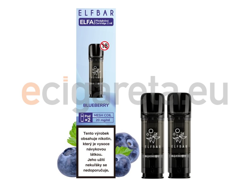 Čerstvě utržené šťavnaté borůvky... Předplněné cartridge Elf Bar ELFA obsahují 2ml liquidu o síle nikotinu 20mg. Cartridge obsahují prvotřídní liquid s nikotinovou solí, díky které dochází k rychlejší a kvalitnější vstřebatelnosti = bez dráždivého pocitu v krku oproti klasickým liquidům. Nedílnou součástí cartridge je spirálka Mesh pro rychlejší žhavení, rovnoměrné odpařování, vynikající chuť liquidu a větší tvorbu páry. Poměr 50VG/50PG