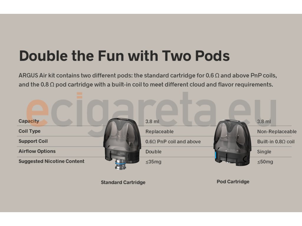 Náhradní Pod Cartridge pro elektronickou cigaretu VooPoo Argus Air Pod Kit o objemu 3,8 ml s integrovanou fixní žhavící hlavou s odporem 0,8ohm. Cartridge je primárně určena pro MTL vapování. Je kompatibilní pouze s modelem elektronické cigarety VooPoo Argus Air Pod Kit.