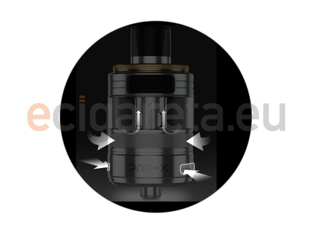 VooPoo PnP-X Pod Tank je revoluční a inovativní hybridní systém kombinující výhody cartridgí a standardních atomizérů se závitem 510. Za tímto zařízením stojí světoznámý výrobce VooPoo. Ve vrchní části zařízení se nachází cartridge s objemem 5 ml, která je kompatibilní s e-cigaretami VooPoo Drag S PnP-X Pod Kit a VooPoo Drag X PnP-X Pod Kit. Ve spodní části se potom nachází odnímatelná základna se závitem 510, díky čemuž budete moci cartridge používat jako klasický atomizér například na mody od stejného výrobce. Je kompatibilní také s dalšími mody se závitem 510. V samotné cartridgi si potom budete moci pohodlně měnit žhavící tělísko. Voopoo PnP-X Pod Tank je kompatibilní se žhavícími hlavami z rodiny VooPoo PnP, lze použít také RBA modul VooPoo PnP-RBA pro namotání vlastní spirálky. Cartridge se skvěle hodí pro přímé potahování do plic (DL), ale také pro vzdušnější klasické šlukování (MTL).