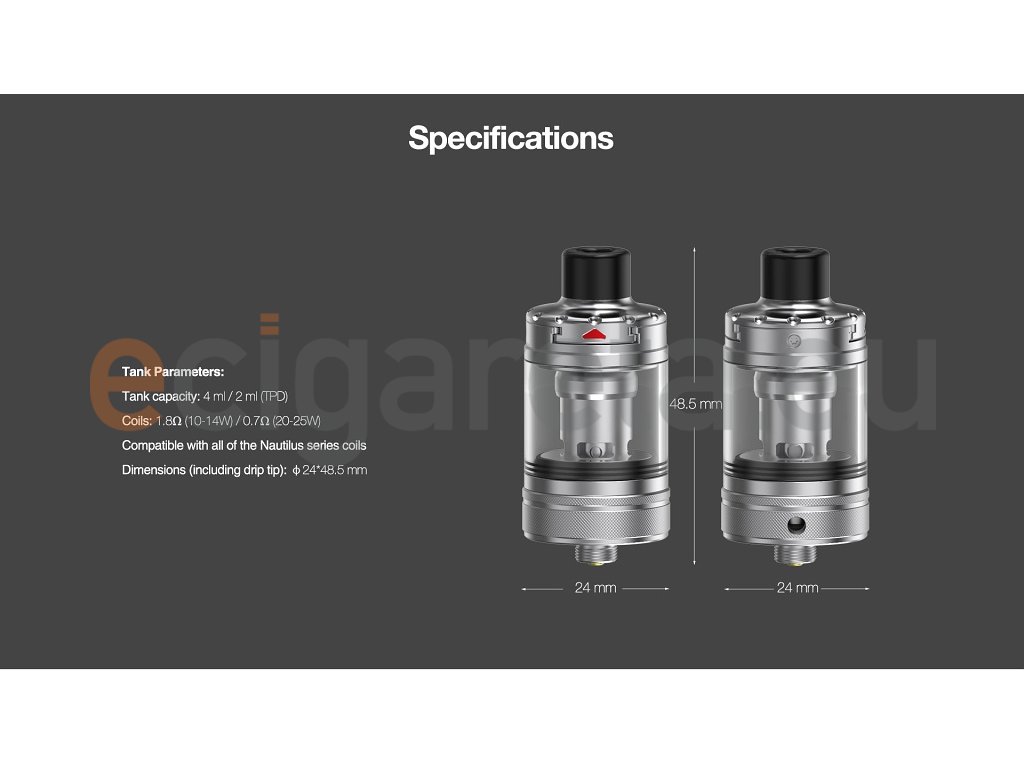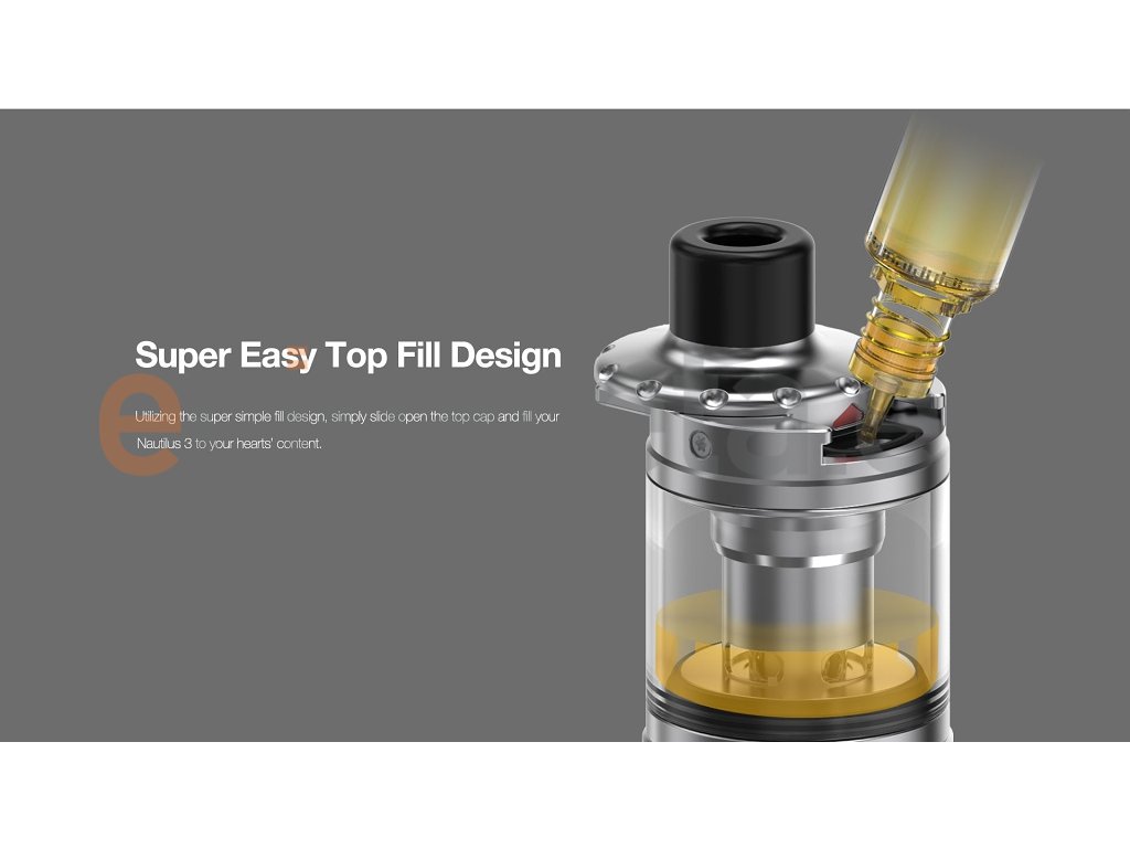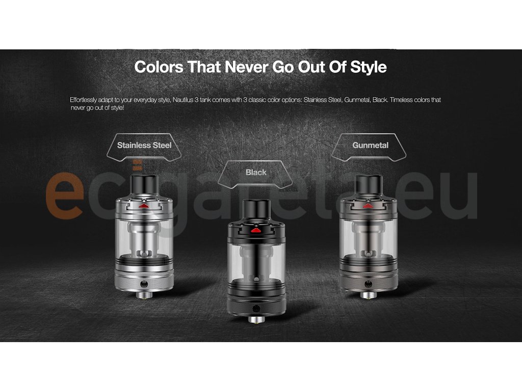 Další z řady nástupců legendárních Clearomizérů Aspire Nautilus, tentokrát ve třetí verzi, vyrobený z nerezu a skla o průměru 24mm. Plně kompatibilní se všemi žhavícími hlavami Nautilus. Propracovaný systém přívodu vzduchu (Airflow) 7 stupňů. Vhodný jak pro MTL, tak DL styl vapování. Jednoduché horní plnění e-liquidem. 2x žhavící hlava Nautilus v SETU.