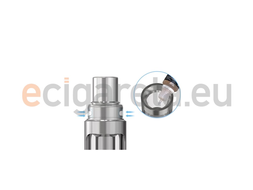 Clearomizer Joyetech Cubis D19 využívá systém horního plnění e-liquidu, kde již nemusíte odšroubovávat celou vrchní základnu Clearomizeru se žhavící hlavou, ale jen část pod náustkem a e-liquid (náplň do elektronické cigarety) plníte jedním ze dvou otvorů.