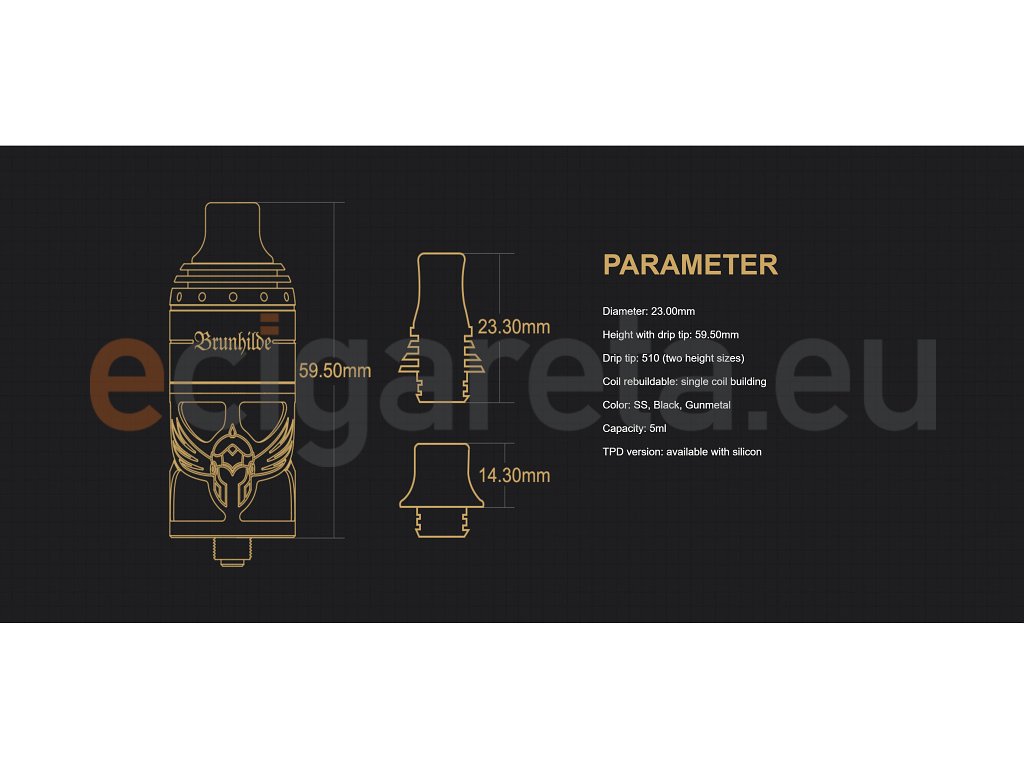 Špičkový RTA atomizér Vapefly Brunhilde, speciálně navržený pro MTL vapování. Vyroben z kvalitní nerezové oceli a rozměrech 59,5 x 23mm. Objem 5ml, závit 510. Top Coiler (Žhavící spirála se nachází v horní části atomizéru). Regulace Airflow.