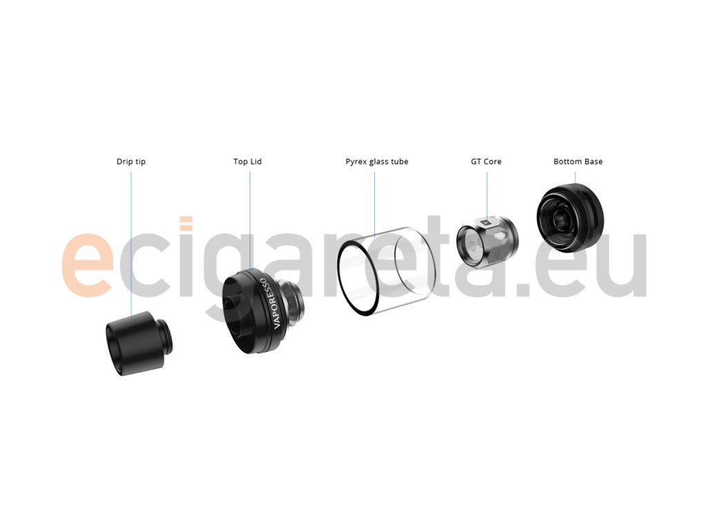 Vaporesso NRG Mini clearomizer o objemu 2ml. Využívá systém horního plnění - po odsunutí vrchní části, plníte liquid otvorem přímo do těla clearomizeru. Celý clearomizer je plně rozebíratelný = snadná údržba. Jeho velkou předností jsou žhavicí hlavy GT, které přináší velkou kouřivost a autentickou chuť liquidu. Žhavicí spirálky jsou obaleny v organické bavlně a zapuštěny do keramického těla. Regulace přívodu vzduchu pro nastavení optimální kouřivosti se nachází ve spodní části.