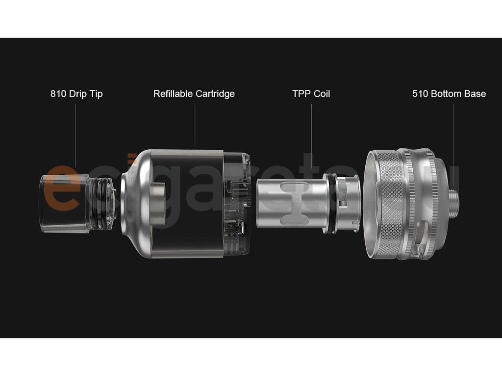 Špičkový propracovaný Pod Clearomizer o objemu 5,5ml a vyměnitelnou Pod cartridgí TPP s podporou stejnojmenných žhavících hlav Voopoo TPP, plně kompatibilní s Cartridgemi Voopoo Pnp, závit 510, Regulovatelné Airflow, vhodný pro DL styl vapování. 2x žhavící hlava Voopoo TPP DM1 0,15ohm a DM2 0,2ohm v SETU. Vyměnitelný náustek (Drip Tip) 810.