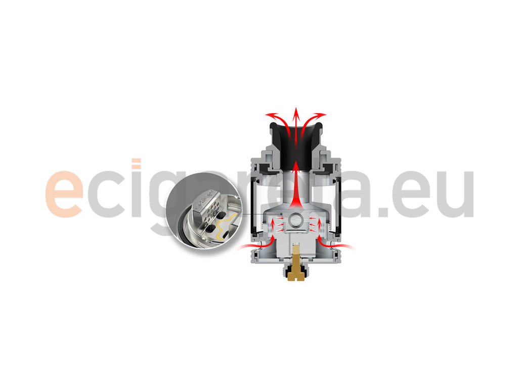 Clearomizér Eclipse RTA nabídne spodní regulaci přísunu vzduchu. Kroužek pro regulaci je otočný a plně regulovatelný. Vzduch je přiváděn zespoda do dvou protilehlých sloupků u základny. Na těchto sloupcích se nachází řada menších otvorů ve tvaru medové plástve. Vzduch je tak přiváděn ke spirálce rovnoměrně a plynule, díky čemuž je výsledná chuť zkrátka jedinečná.