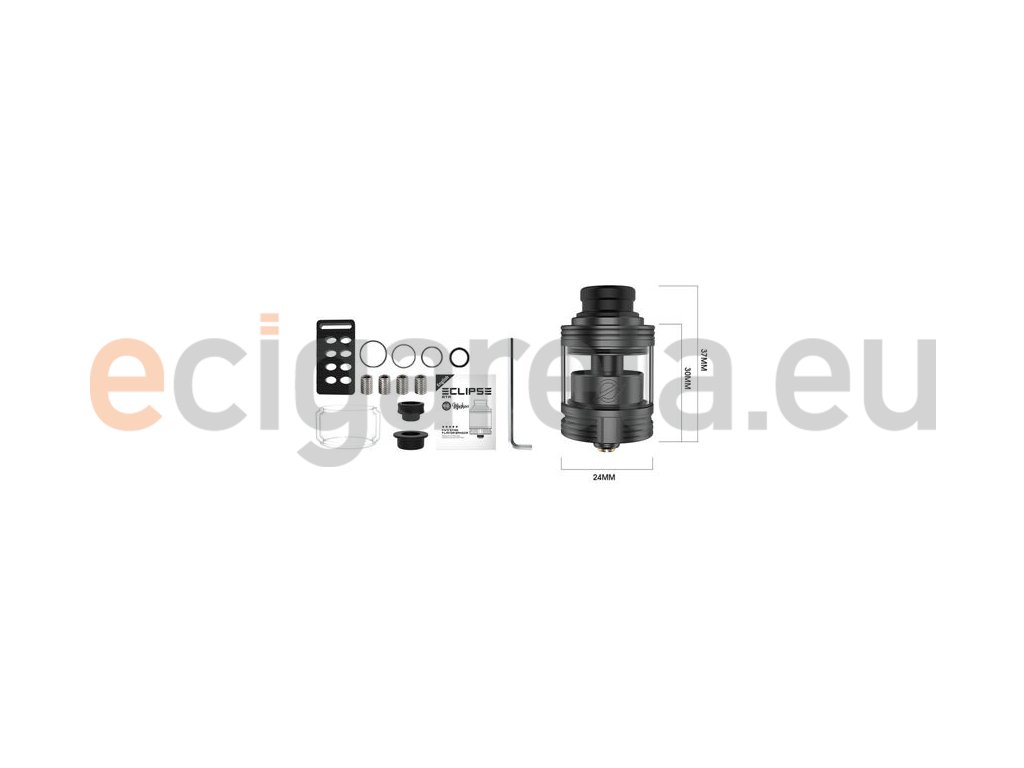Nový RTA clearomizér Eclipse od výrobce Yachtvape vzešel ze spolupráce společnosti Yachtvape se světoznámým recenzentem Mike Vapes. Přináší elegantní design a řadu výhod v čele s promyšleným systémem airflow, perfektní základnou pro umístění spirálky a vynikajícím podáním chuti díky pečlivě navržené vnitřní struktuře atomizéru. Délka atomizéru činí jen 37 mm a průměr se zastavil na 24 mm. Ve spodní části se nachází závit typu 510 s pozlaceným centrpinem pro perfektní vodivost. Clearomizér je kompatibilní s drtivou většinou modů na trhu. Tělo je vyrobeno z nerezové oceli, kterou doplňuje pyrexový tank. Vrchní část je opatřena náustkem s uchycením typu 810, který si snadno nahradíte vlastním náustkem. Objem clearomizéru činí 3,5 ml s větším sklem. V balení máte k dispozici také menší rovné sklo s objemem 2 ml. V případě nutnosti plnění je k dispozici vrchní systém doplňování e-liquidu.