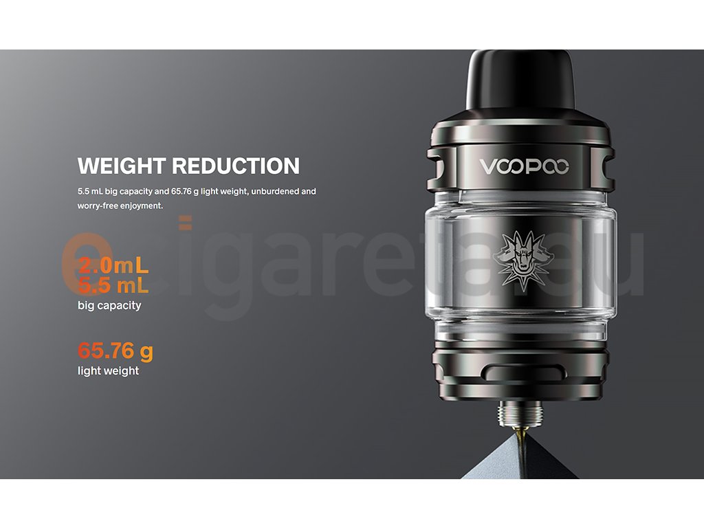Parametry a specifikaceVýrobce: VooPoo Objem: 5,5 ml Odpor žhavících hlav v balení: 0,15Ω, 0,2Ω Materiál spirálek: Mesh NiCr, FeCr Styl potahování: DL (Direct Lung) Způsob plnění: Vrchní výsuvné Závit: 510 Regulace přívodu vzduchu: Horní airflow Rozměry: 52,95 mm × 28,4 mm (29 mm bubble) Materiál: Nerezová ocel + borosilikátové sklo Legislativa: Není určeno pro náplně obsahující nikotin Barva: Black (Černá)