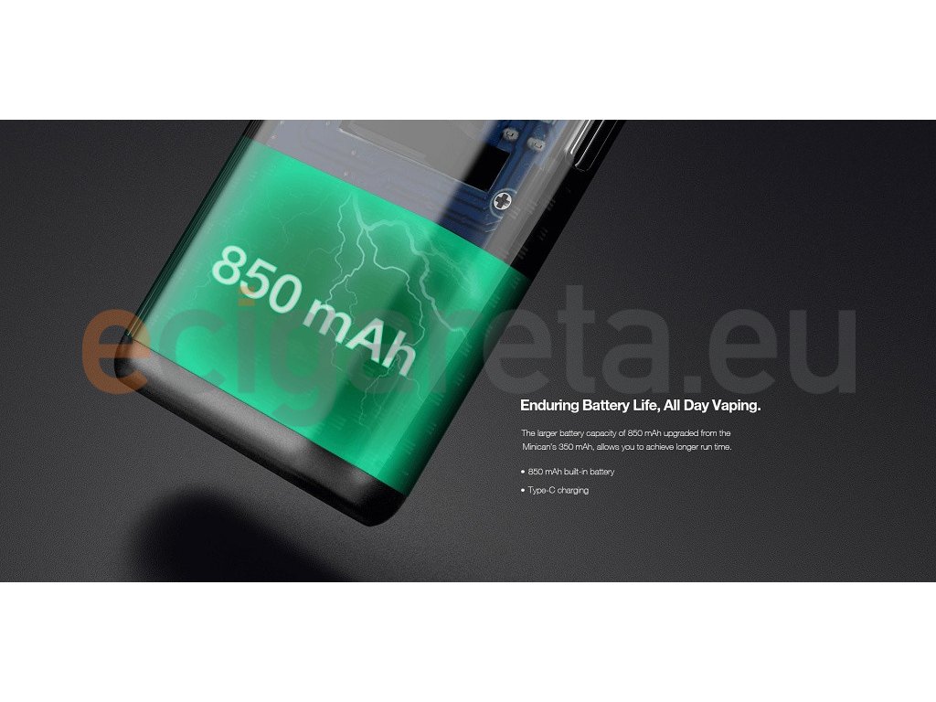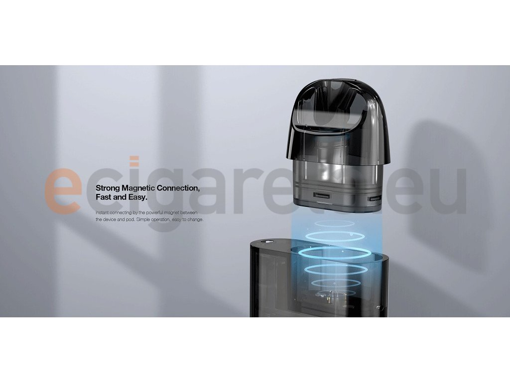 Malá a lehká Pod elektronická cigareta s integrovanou baterií o kapacitě 850mAh, automatická aktivace potahu, rychlé USB-C nabíjení, lehce vyměnitelná a plnitelná Pod cartridge o objemu 3ml s integrovanou žhavící hlavou s odporem 0,8ohm. Rozměry: 75mm x 40mm x 15,8mm.