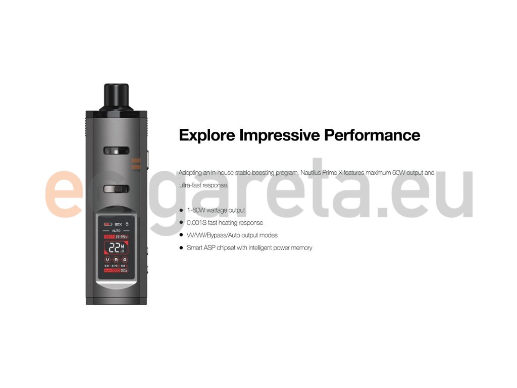 Elegantní Pod Grip na baterie typu 18650, regulace přívodu vzduchu, zinková slitina, USB-C nabíjení, výkon až 60W, režimy VV, VW, Bypass, Auto, čip ASP, TFT displej. Kompatibilní se žhavícími hlavami Aspire Nautilus a Aspire BP Coil. MTL, RDTL, a DTL styl vapování. Pod cartridge Nautilus Prime X.