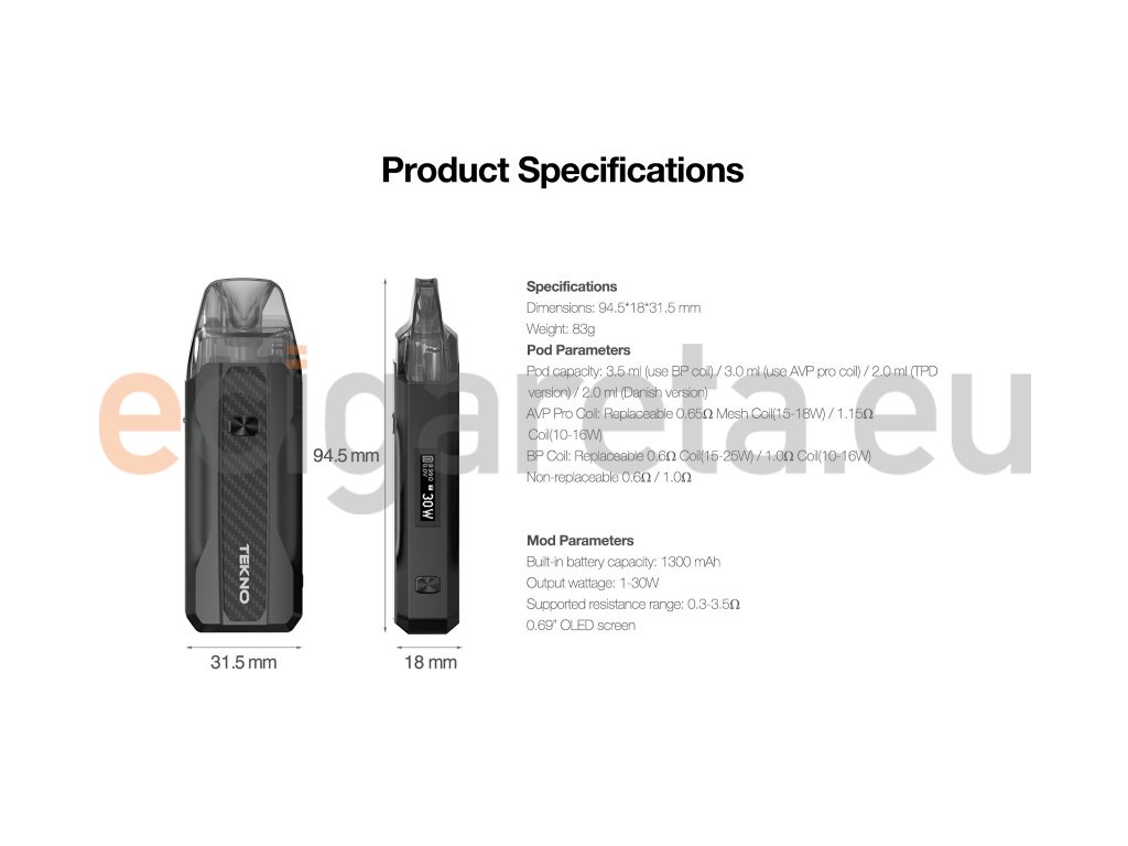 Výkonná Pod elektronická cigareta s kapacitou baterie 1300mAh, výkonem až 30W a displejem o velikosti 0,69 ”. Tělo vyrobeno ze zinkové slitiny. Vhodná pro MTL i RDTL styl vapování. Automatická i manuální aktivace baterie. USB-C nabíjení.