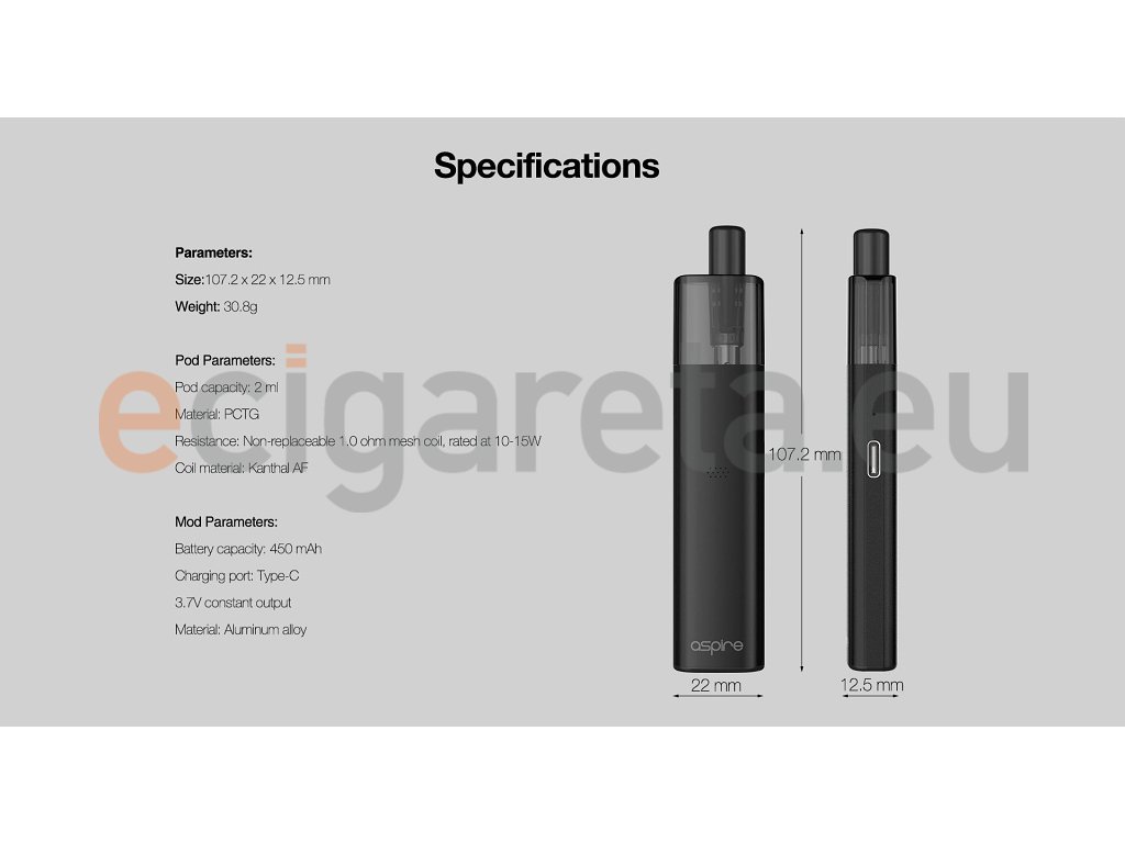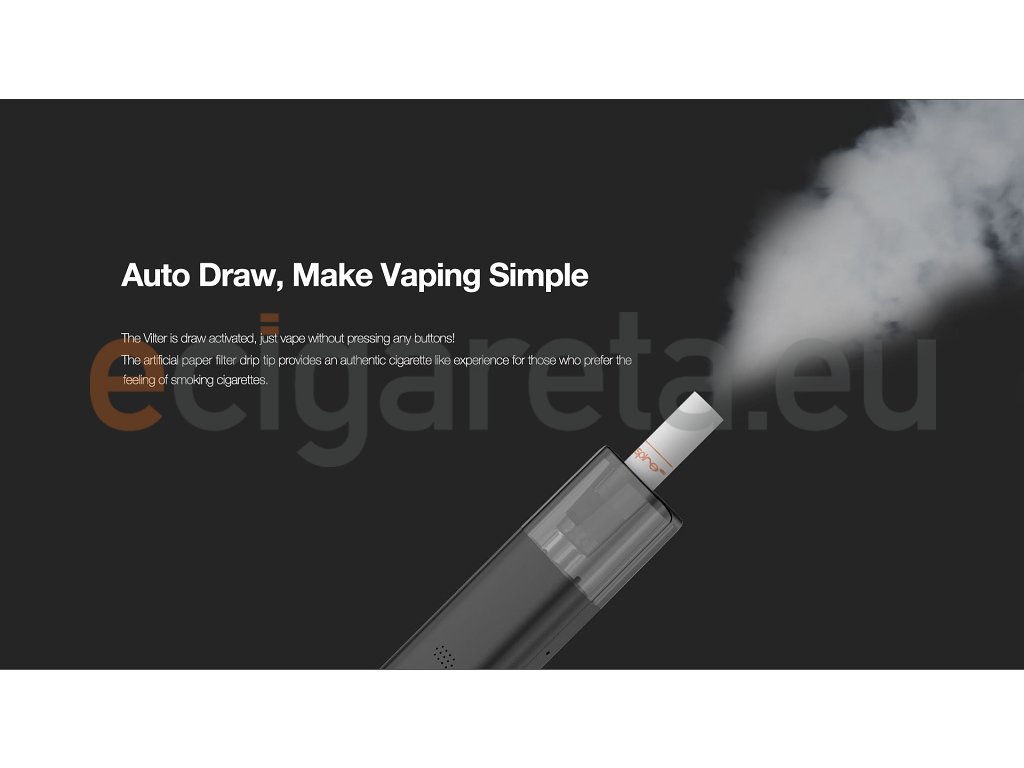 Unikátní automatická Pod elektronická cigareta s možností použití jak klasického Delrinového náustku, tak speciálních umělých papírových filtrů, které dokonale simulují potah jako u klasické cigarety. Vestavná baterie s kapacitou 450mAh, Pod cartridge o objemu 2ml se zabudovanou žhavící hlavou s mesh spirálkou s odporem 1,0ohm. Automatická aktivace potahu, USB-C nabíjení. Rozměry: 107,2mm x 22mm x 12,5mm.