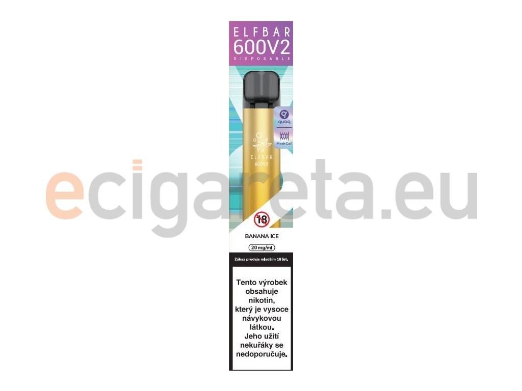 Zralý banán s ledovou dochutí... Elf Bar 600 V2 je vylepšený model nejoblíbenější ,,jednorázovky´´ na světě, který se prezentuje elegantním celokovovým tělem baterie, inovativním propojením cartridge s baterií, MTL vapováním a hlavně novou Mesh spirálkou QUAQ, která kombinuje ultra jemnou síťovinu s vysoce absorpční bavlnou. Cartridge o objemu 2ml disponuje liquidem SALT o síle nikotinu 20mg.