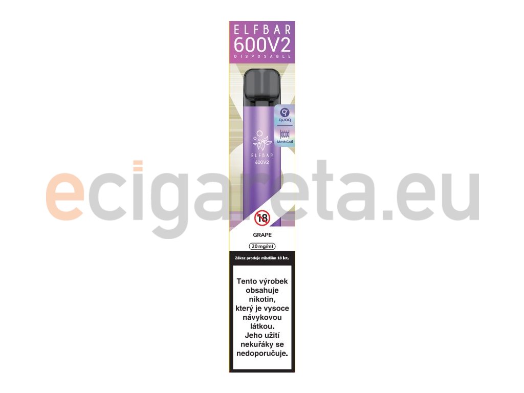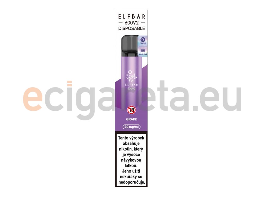 Chuť čerstvých hroznů se sladkokyselou dochutí... Elf Bar 600 V2 je vylepšený model nejoblíbenější ,,jednorázovky´´ na světě, který se prezentuje elegantním celokovovým tělem baterie, inovativním propojením cartridge s baterií, MTL vapováním a hlavně novou Mesh spirálkou QUAQ, která kombinuje ultra jemnou síťovinu s vysoce absorpční bavlnou. Cartridge o objemu 2ml disponuje liquidem SALT o síle nikotinu 20mg.