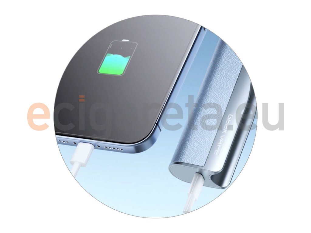 Součástí balení není standardní dobíjecí USB-C kabel pro nabíjení e-cigarety a powerbanky.