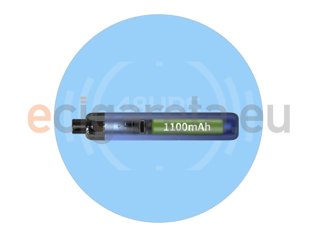 Uvnitř těla e-cigarety se nachází integrovaná baterie se solidní kapacitou 1100 mAh. Ta se postará o dlouhé hodiny nerušeného potahování a zároveň dodá e-cigaretě potřebný výkon pro použití jednoho ze tří režimů intenzity výstupu. Baterii můžete kdykoliv pohodlně dobít přímo na těle připojením USB-C kabelu. Lze dobíjet proudem až 1 A.