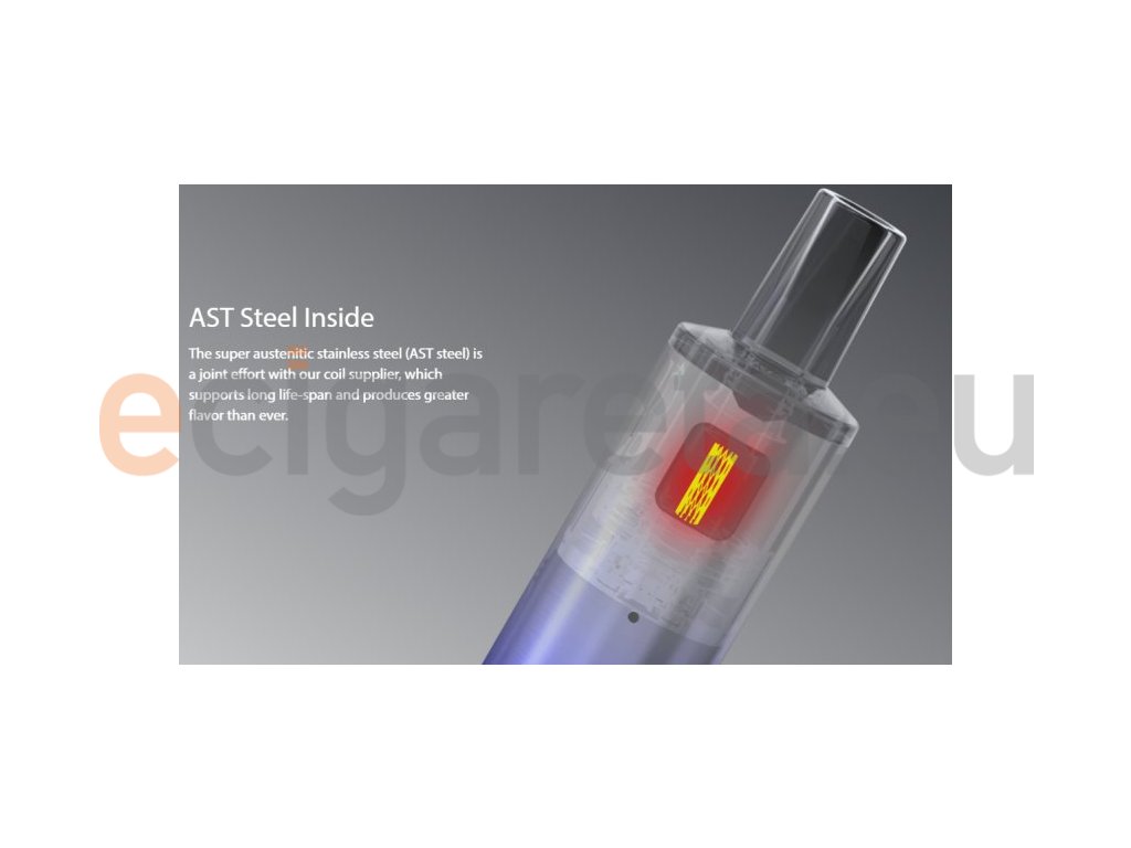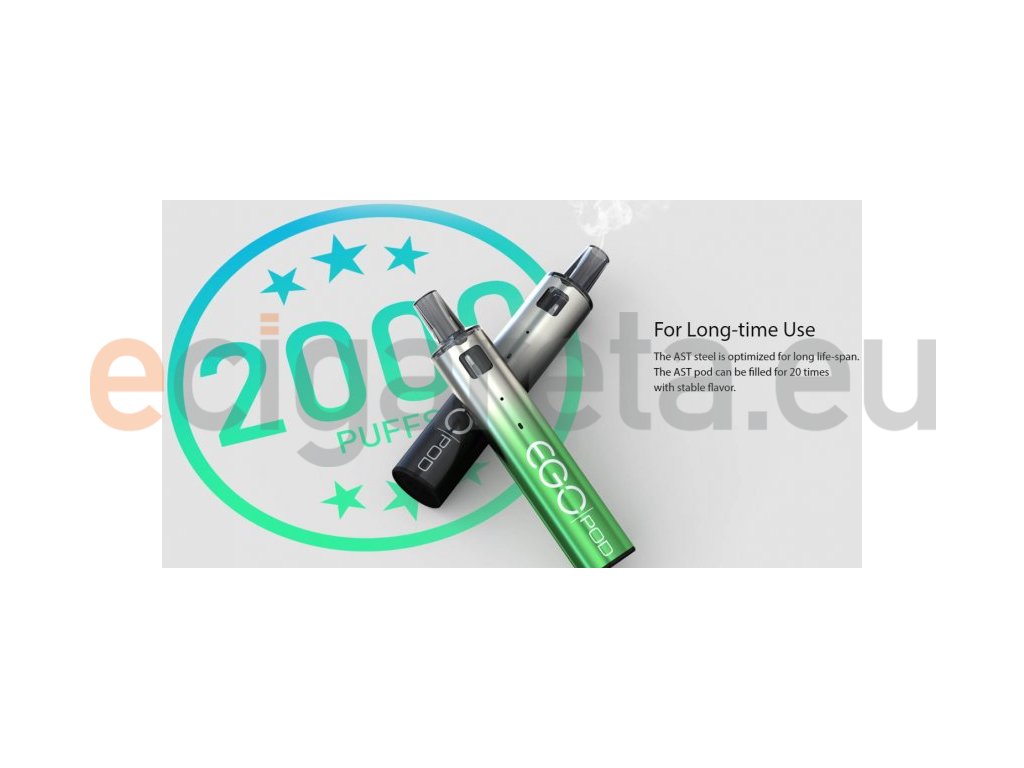 Joyetech eGo AIO AST Pod patří do tzv. skupiny kapesních elektronických cigaret, jejichž výhodou jsou kompaktní rozměry, autentické podání chuti a nízká pořizovací cena. Tělo baterie disponuje zabudovaným monočlánkem o kapacitě 1000mAh s automatickým spínačem a konstantním napětím pro stabilní výkon. Čip AVATAR IC 1.0 přináší ochranu proti zkratu, přehřátí a vybití, či 8 vteřinovou ochranu žhavení. Vyměnitelná cartridge (POD) se žhavící hlavou o odporu 1ohm pojme až 2ml liquidu. Nabíjení umožňuje micro USB vstup. Tato inovace je vhodná pro kouření ve stylu MTL, tedy klasického šlukování pusa-plíce.