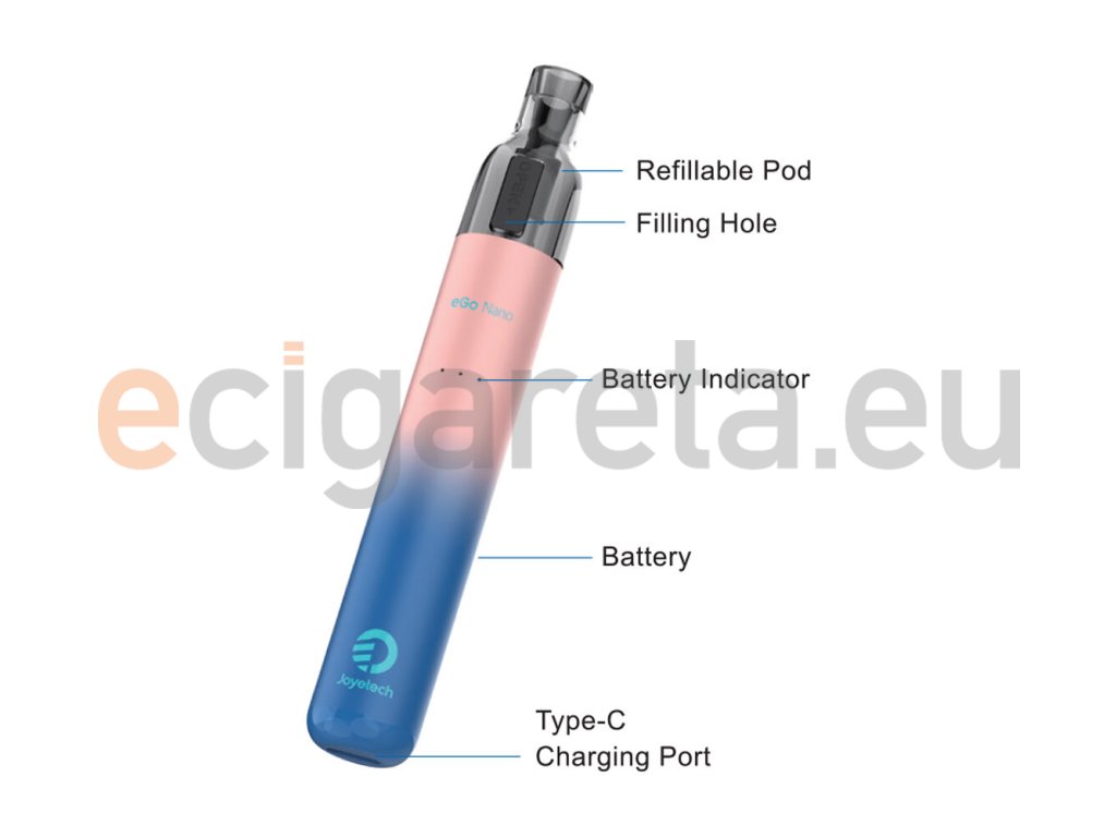 Joyetech eGo Nano Pod Kit pokračuje v zaběhnuté tradici zařízení modelové série eGo a představuje se opět v trubkovém pen-style těle s kompaktními rozměry a moderními cartridgemi. Délka celé e-cigarety činí jen 113.4 mm a průměr se zastavil na krásných 17.5 mm. Vše potom umocní výběr odvážných barevných variant a speciální soft-touch povrchová úprava pro co nejkomfortnější držení v ruce.