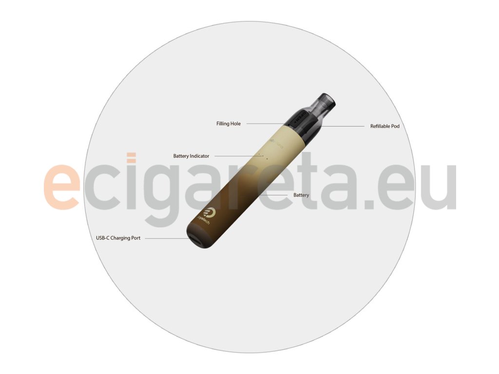 V těle e-cigarety na vás čeká integrovaná baterie s kapacitou 800 mAh pro aktivní mnohahodinové používání bez nutnosti nabíjení. Integrovaná baterie se postará také o rychlý náběh žhavení a bezproblémové fungování. V případě nutnosti si budete moci baterii opětovně dobít prostřednictvím moderního portu USB-C, lze dobíjet proudem až 1A.