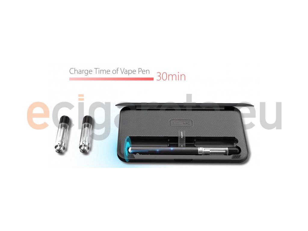 Joyetech eRoll MAC PCC se představuje v celé své kráse i s legendárním dobíjecím pouzdrem, které disponuje vestavěnou baterií o kapacitě 2000mAh. Po otevření moderně navrženého PCC pouzdra se nám nabízí prostor pro nabití e-cigarety eRoll MAC Vape Pen, které bude plně nabito za pouhých 30min. Výrobce myslel i na menší objem cartridge a proto vedle dobíjecí části pro ecigaretu je prostor pro náhradní dvě cartridge. Na boční straně pouzdra se nacházejí LED indikátory stavu nabití pro ecigaretu a pouzdro, které jednoduše nabijete přes kabel USB Typ-C. Vyměnitelné cartridge o objemu 0,55ml obsahují vestavěnou keramickou žhavicí hlavu o odporu 1,5ohm, které jsou přizpůsobeny pro MTL vapování a přináší čistou a měkkou chuť, zejména pro nikotinovou sůl a CBD. Automatická baterie eRoll MAC disponuje kapacitou 180mAh s konstantním napětím 3,7V, maximálním výkonem 11W a LED indikátorem stavu nabití.
