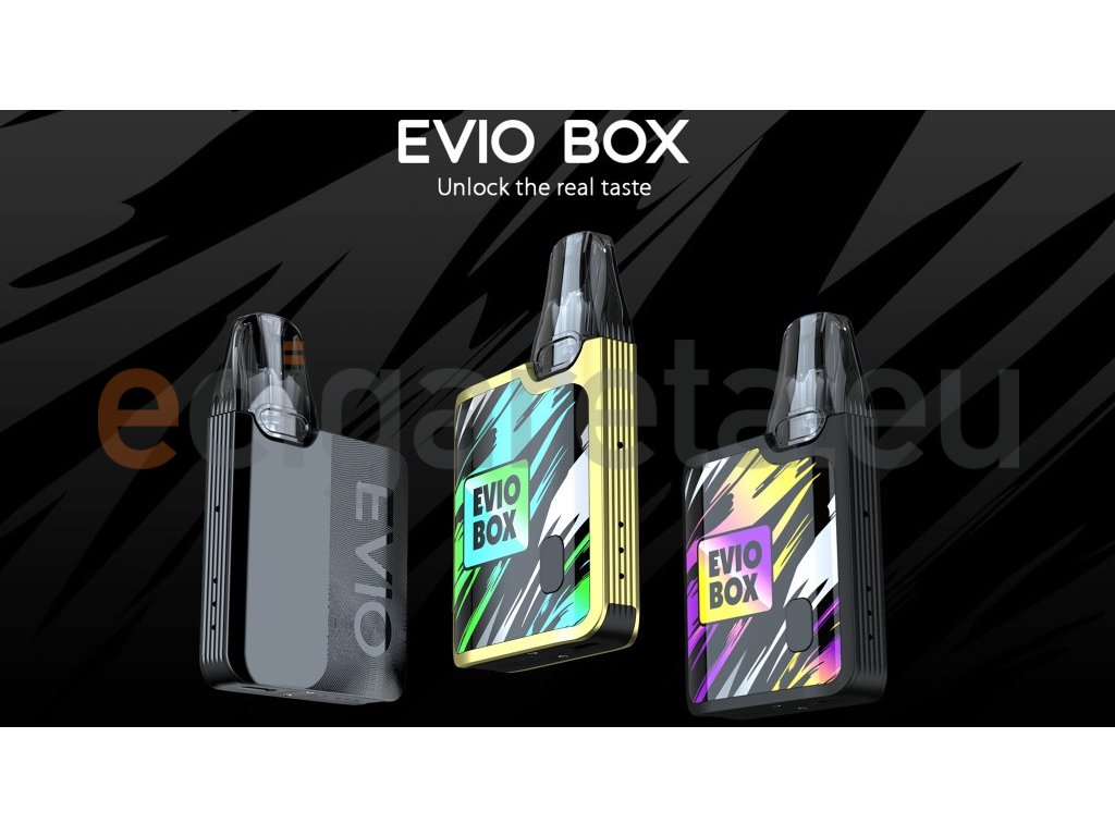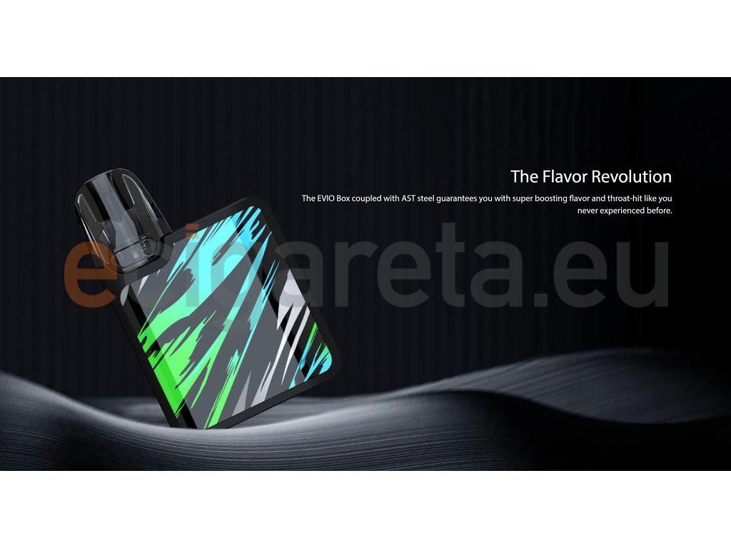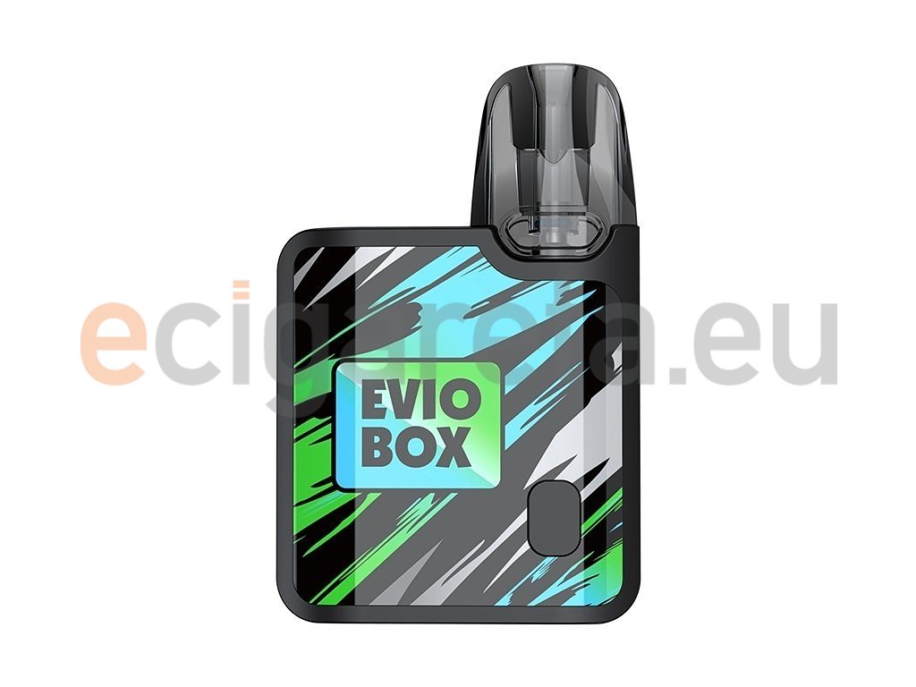 Kompaktní Pod elektronická cigareta, která se vejde pohodlně do kapsy nabízí dostatečný výkon a prvotřídní čip s technologií AST. Joyetech Evio Box nabízí vysokou rychlost žhavení už za 0,001 s, rychlé nabíjení pomocí moderního USB-C konektoru, dvojí způsob spínání potahu, a to jak plně automatický, tak manuální pomocí tlačítka. O samotný výkon s postarají hned tři režimy intenzity žhavení. Kapacita baterie 1000mAh, objem Cartridge 2ml s dvojitým Airflow systémem, rozměry 75 x 49 x 14 mm, 2x žhavící hlava Joyetech EN v SETU. Joyetech EVIO Box je vhodný jak pro klasické MTL šlukování, tak i pro utaženější DL, kdy je pára vdechována přímo do plic. Barevné provedení Black Jungle.