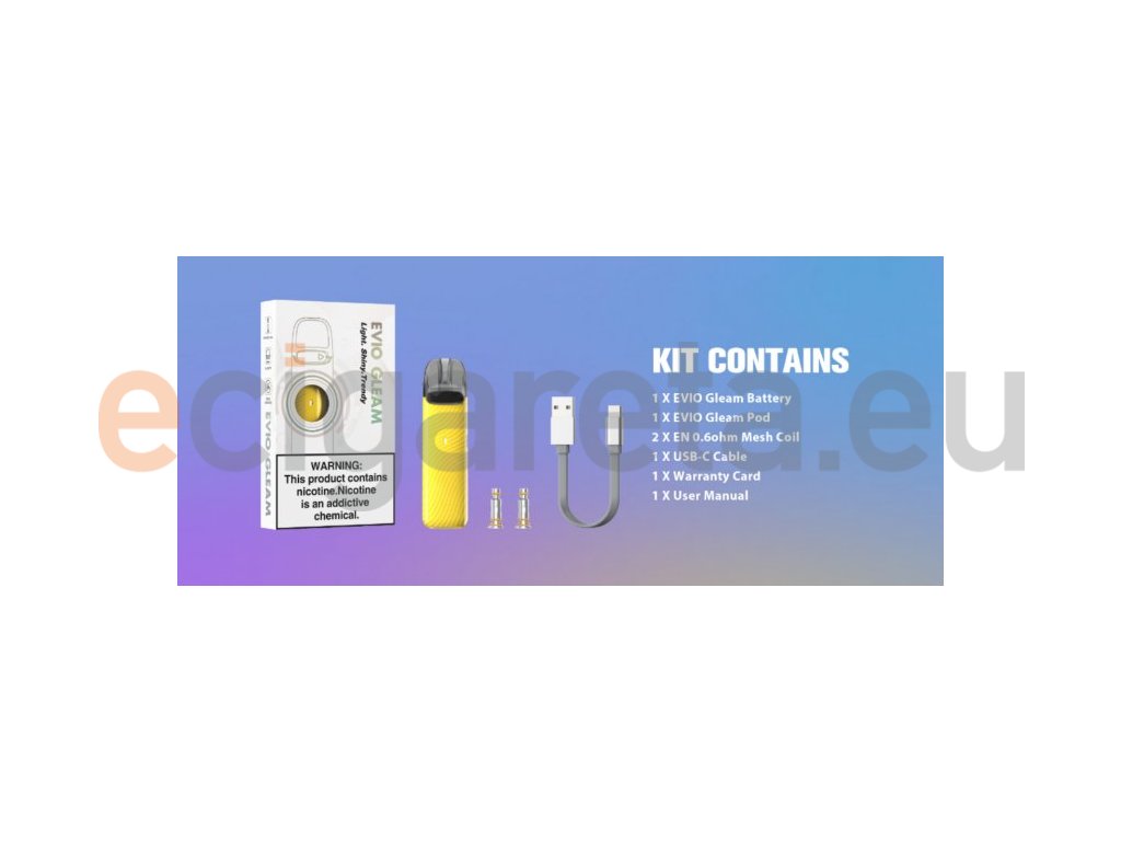 Joyetech EVIO Gleam je elegantní elektronická cigareta s hladkým povrchem a křišťálově čistým vzhledem. Integrovaný monočlánek o kapacitě 900mAh disponuje LED indikátorem stavu nabití, automatickým výkonem až 20W a USB-C portem pro rychlé nabíjení. Cartridge (POD) s vyměnitelným atomizerem řady EN nabízí pohodlné vrchní plněním o objemu až 2ml. Výrobce si připravil pro tuto e-cigaretu novou Mesh spirálku o odporu 0,6ohm