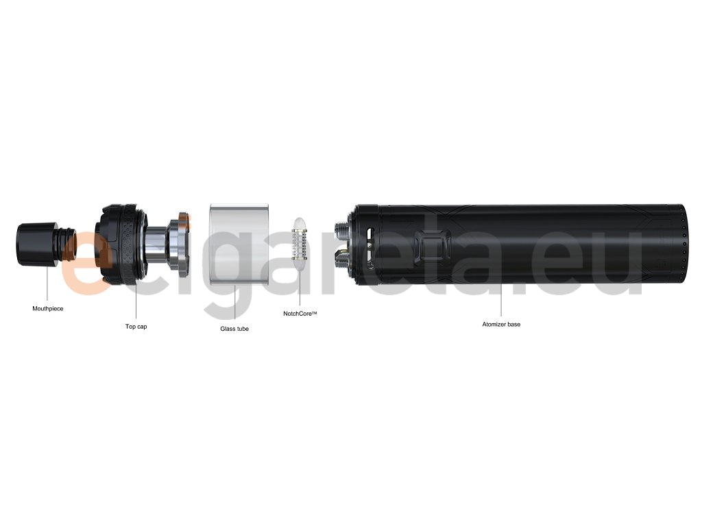 Elektronická cigareta s kapacitou baterie 2300mAh s podporou režimů konstantního a přímého napětí baterie. Inovativní Clearomizer Joyetech NotchCore konstruovaný pro přímého potahování do plic (DL), plynulou regulací Airflow, horní plnění s kapacitou 2,5ml. 2x revoluční žhavící spirálka Joyetech NotchCoil v SETU. Micro USB nabíjení. Rozměry 127,5 x 22mm, závit 510. Barevné provedení Černá.
