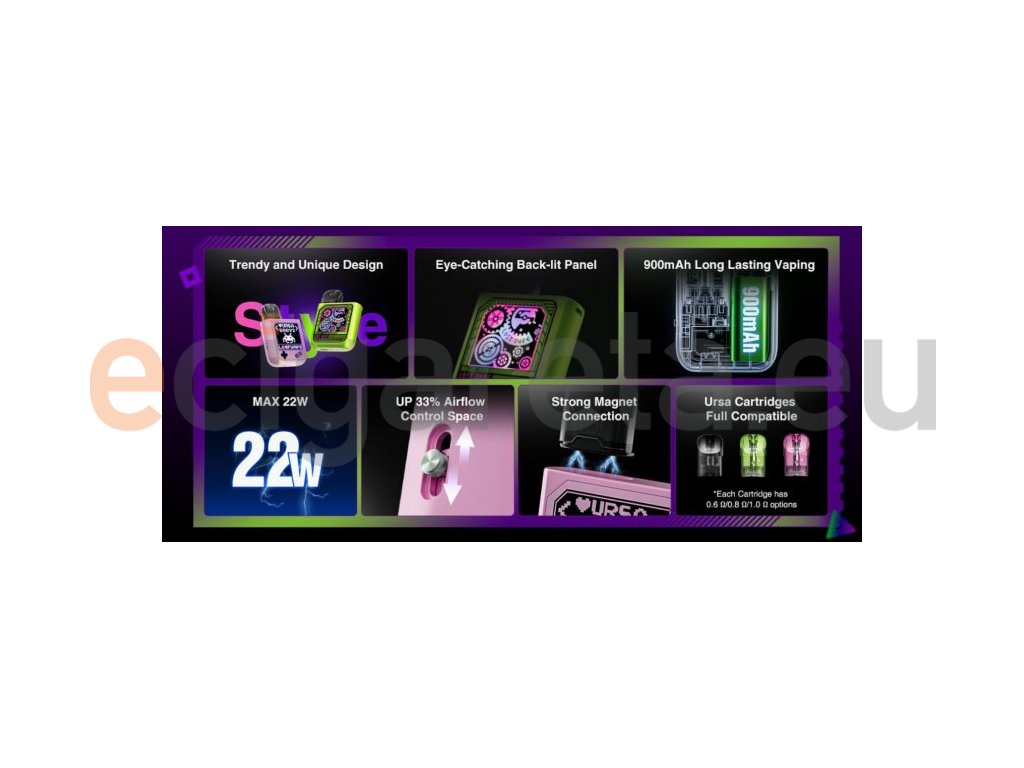 Lost Vape představuje elektronickou cigaretu Ursa Baby 2, která přináší jedinečný designe s poutavým podsvíceným panelem. Ergonomické tělo baterie disponuje integrovaným monočlánkem o kapacitě 900mAh s automatickým spínačem, výstupním výkonem až 22W a USB-C portem pro rychlé nabíjení. Cartridge o objemu 2,5ml jsou plně kompatibilní s předchozími modely a v základním balení naleznete cartridge o odporu 0,6ohm a 0,8ohm.