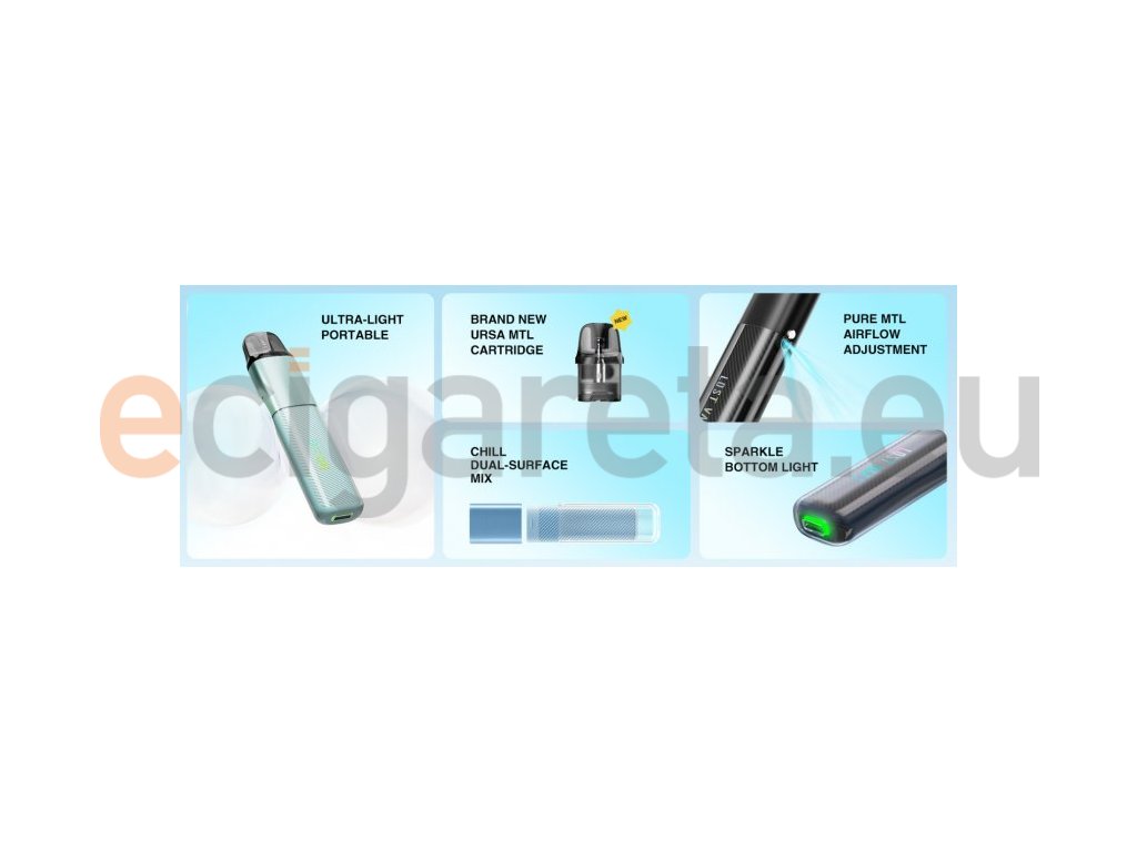 Není určeno pro náplně obsahující nikotin! Lost Vape Ursa Nano AIR Pod je elegantní elektronická cigareta s hladkým povrchem, decentním designem a důmyslným přívodem vzduchu pro čistý MTL vaping. Vestavěný monočlánek o kapacitě 800mAh disponuje automatickým výkonem až 16W, USB-C portem pro rychlé nabíjení a automatickým spínačem. Vyměnitelné cartridge o objemu 2,5ml jsou plně kompatibilní s předchozími modely cartridgí Ursa Nano. Výrobce si pro tento model připravil novinku Ursa MTL cartridge s vestavěnou žhavicí hlavou o odporu 1,2ohm.