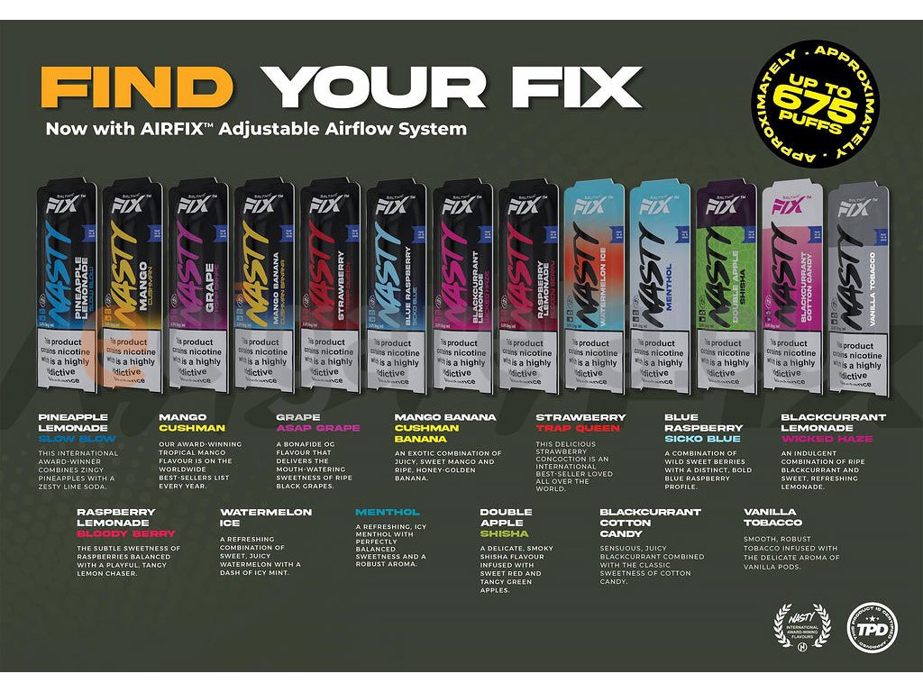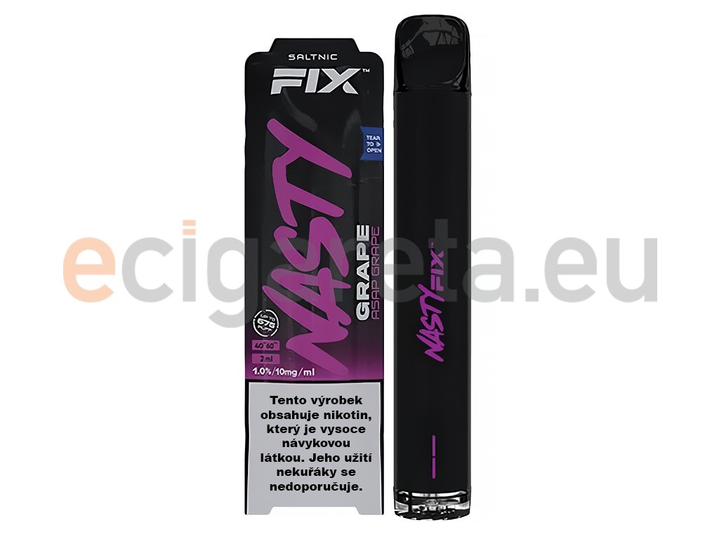 Dokonalý mix červeného hroznového vína, lesních plodů s příjemným ledovým dozvukem. Nasty Juice Air Fix je jednorázová elektronická cigareta obsahující 2 ml předplněného e-liquidu uvedené příchutě. Obsahuje nikotinovou sůl, která se rychleji vstřebává do těla a není tak nutné časté potahovaní, jako je tomu klasických liquidů. Cigareta je napájena vestavěnou baterií o kapacitě 700 mAh, se kterou dosáhnete až 675 potažení. Spodní část zařízení disponuje regulací přívodu vzduchu pro optimální nastavení kouřivosti. Jde o ideální řešení pro kuřáky, kteří potřebují jednorázově překlenout pobyt v nekuřáckém prostředí. Obsah nikotinu 10mg/1ml.