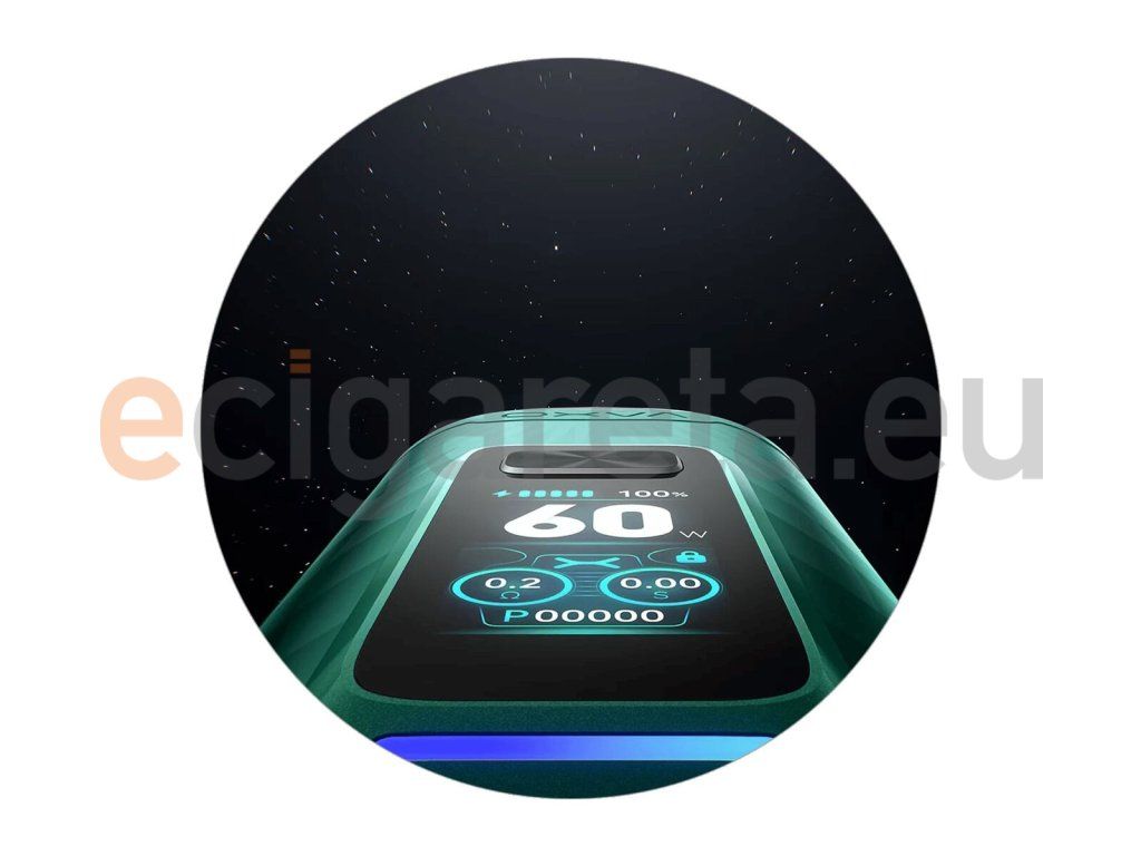 Přední panel zdobí mohutný celobarevný displej, který vás bude během používání neustále informovat o všech parametrech a aktuálním stavu baterie. Všechny položky jsou krásně čitelné a jedním pohledem si vždy snadno ověříte, jaký máte nastavený výkon, jaký je odpor cartridge, kolik máte odvapováno potahů nebo zda není e-cigareta uzamčená. Vše potom doplní krásné barevné animace zobrazené na displeji během potahu pro vizuální požitek při vapování.