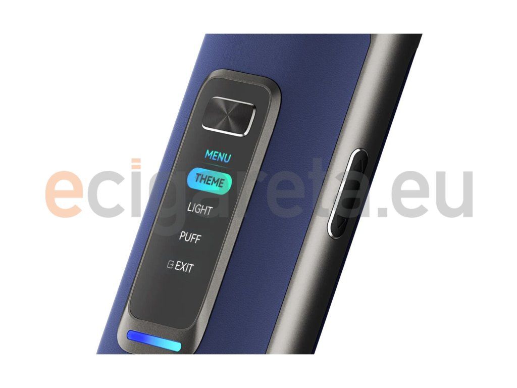 Přední panel zdobí mohutný celobarevný displej, který vás bude během používání neustále informovat o všech parametrech a aktuálním stavu baterie. Všechny položky jsou krásně čitelné a jedním pohledem si vždy snadno ověříte, jaký máte nastavený výkon, jaký je odpor cartridge, kolik máte odvapováno potahů nebo zda není e-cigareta uzamčená. Vše potom doplní krásné barevné animace zobrazené na displeji během potahu pro vizuální požitek při vapování.