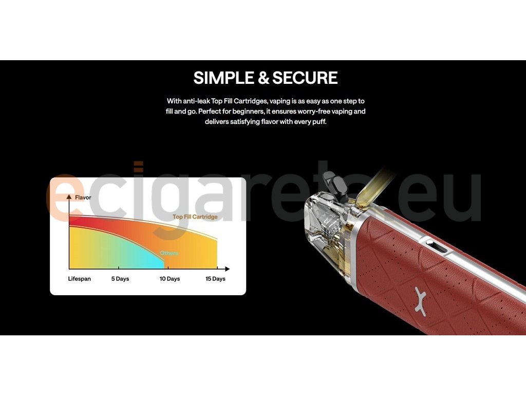 Parametry a specifikaceRozměry: 113.7 x 26 x 14.6 mm Kapacita baterie: Integrovaná 1000 mAh Režimy: Bypass Metody spínání potahu: Automatická aktivace potažením Výstupní výkon: 5-30 W (dle použité Pod Cartridge) Podporovaný odpor: dle kompatibilní Pod Cartridge Způsob nabíjení: USB-C port (5V/1A) Regulace výkonu: Automaticky Objem Pod Cartridge: 2 ml Styl potahování: MTL, RDL Odpor žhavících hlav v balení: 0,8Ω Regulace přívodu vzduchu (Airflow): Ano (stupňovaná) Hmotnost: 41 g Barva: Graffitti Pink (Růžová) Materiál: Umělá kůže + PCTG + plast |