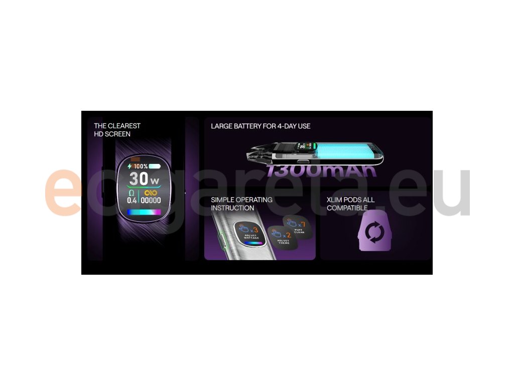 Elektronická cigareta OXVA Xlim Pro byla vyhlášena nejoblíbenějším POD zařízením mezi vapery za období 2023 a 2024. Nyní přichází výrobce s druhou řadou, která si pro Vás přichystala mnoho novinek. Elegantní a čistý designe těla baterie zdobí 0,56 palcový barevný Ultra-HD displej, který poskytuje vynikající přehled o nastavení všech hodnot. Vestavěný monočlánek nabízí vyšší kapacitu baterie 1300mAh, USB-C port s 2A nabíjením a výkonem až 30W. Na boční straně baterie je umístěno regulační tlačítko pro přívod vzduchu, díky kterému si jednoduše nastavíte RDL nebo MTL režim vapování. V obsahu balení najdete cartridge Xlim V3 s horním plněním - není potřeba vyndavat cartridge z těla baterie při plnění liquidem. Cartridge V3 jsou plně kompatibilní s verzí V2.