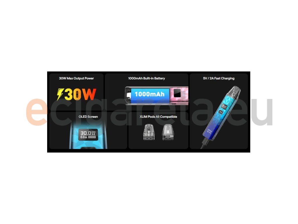 Populární POD systém OXVA Xlim představuje řadu Classic Edition, která vychází z první veleúspěšné řady těchto e-cigaret, avšak nese s sebou prvky nejmodernějšího zařízení. Ergonomické tělo baterie z hliníkové slitiny disponuje integrovaným monočlánkem o kapacitě 1000mAh, který s přehledem vydrží běžnému vaperovi po celý den. O super rychlé nabití se postará USB-C port (5V/2A) umístěný na spodní straně zařízení. Postranní airflow je regulován pomocí speciální páčky, která vám umožní si vzduch nastavit přesně podle vaší chuti. Xlim zároveň disponuje regulovatelným výkonem 5-30W, který můžete sledovat na OLED displeji na přední části zařízení. Pod displejem se nachází ovládací tlačítko, které můžete použít pro sepnutí, nebo využít funkci automatického potahu. V obsahu balení najdete cartridge Xlim V3 s horním plněním - není potřeba vyndavat cartridge z těla baterie při plnění liquidem.