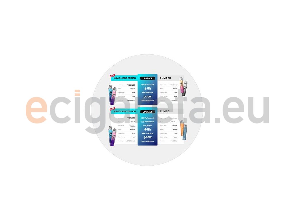 Oproti původní variantě Xlim Pod nabídne upgradovaný model Classic Edition větší kapacitu baterie, která lépe odpovídá dnešním standardům ve světě pod systémů. Díky větší kapacitě si užijete dlouhé hodiny nerušeného vapování. V případě potřeby si potom můžete baterii dobít díky upgradovanému 2A nabíjení, do plné kapacity se zvládne nabít už za 30 minut.