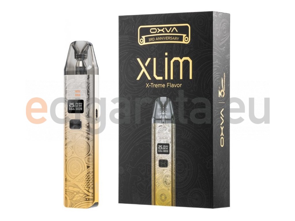 Speciální edice oblíbené elektronické cigaretě ke třetímu výročí společnosti OXVA. Ergonomické tělo baterie z hliníkové slitiny váží pouhých 47 gramů a na délku měří jen 11,1cm. Přes drobné rozměry ukrývá tělo integrovaný monočlánek o kapacitě 900mAh, který s přehledem vydrží běžnému vaperovi po celý den. O superrychlé nabití se zároveň postará USB-C port umístěný na spodní straně zařízení. Těšit se můžete na jedinečné řešení přívodu vzduchu. Postranní airflow je regulován pomocí speciální páčky, která vám umožní si vzduch nastavit přesně podle vaší chuti ve čtyřech různých stupních vzdušnosti. Xlim zároveň disponuje regulovatelným výkonem 5-25W, který můžete sledovat na OLED displeji na přední částí zařízení. Pod displejem se nachází ovládací tlačítko, které můžete použít pro sepnutí, nebo využít funkci automatického potahu a tlačítko na vapování nepoužívat. Zařízení také disponuje automatickou detekcí odporu žhavící hlavy a nastavuje tak ideální výkon. Zbrusu nové cartridge Xlim V2 byly navrženy tak, aby naprosto zabraňovaly možnému protékání. Nabízí jednoduché boční plnění a pojmou až 2ml liquidu. Vybrat si můžete z odporu 0,8ohm a 0,6ohm. Obě cartridge přináší výrazné podání chuti a uspokojivý throat hit.