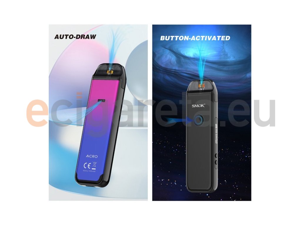 Smoktech ACRO je kompaktní elektronická cigareta s POD systémem a automatickým výkonem až 25W. Tělo baterie s vestavěným monočlánkem o kapacitě 1000mAh disponuje USB-C nabíjecím portem pro rychlé nabíjení a inovativní regulací přívodu vzduchu. Tvorbu páry zajišťuje nejen spínací tlačítko, ale i systém automatického žhavení - stačí pouze potáhnout z náustku. Na boční straně ergonomického těla baterie je umístěn OLED displej, který umožňuje jednoduché nastavení hodnot a zobrazuje všechny potřebné informace. Vyměnitelná cartridge (POD) obsahuje žhavicí hlavou Meshed o odporu 0,8ohm a pojme až 2ml liquidu.