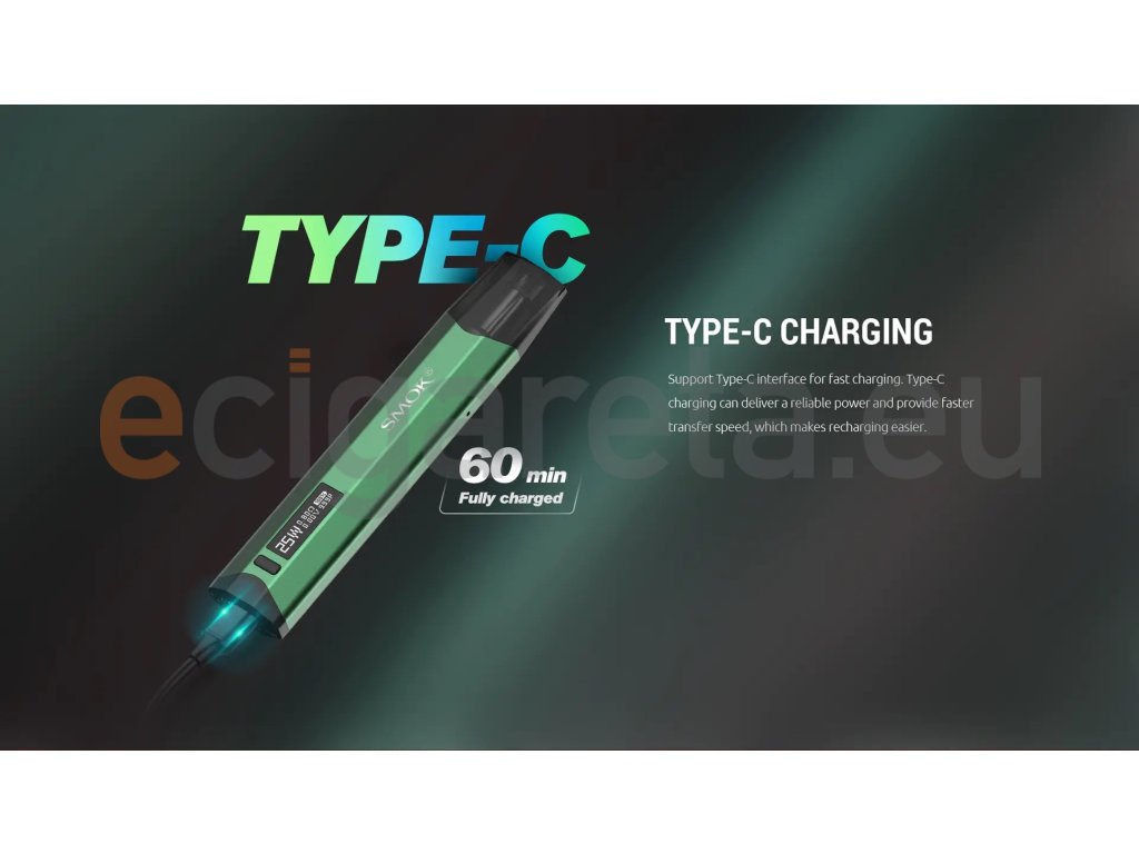 O nabíjení elektronické cigarety se postará vestavěný moderní USB-C konektor a plné nabití trvá dle výrobce cca 1 hodinu.
