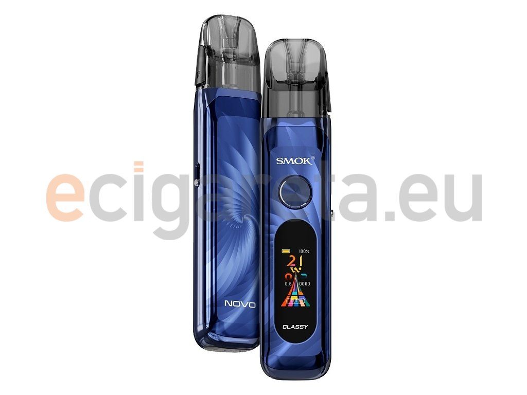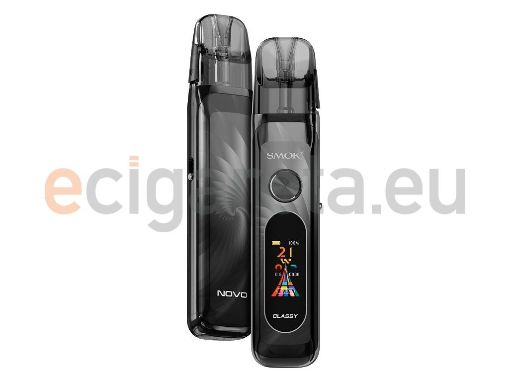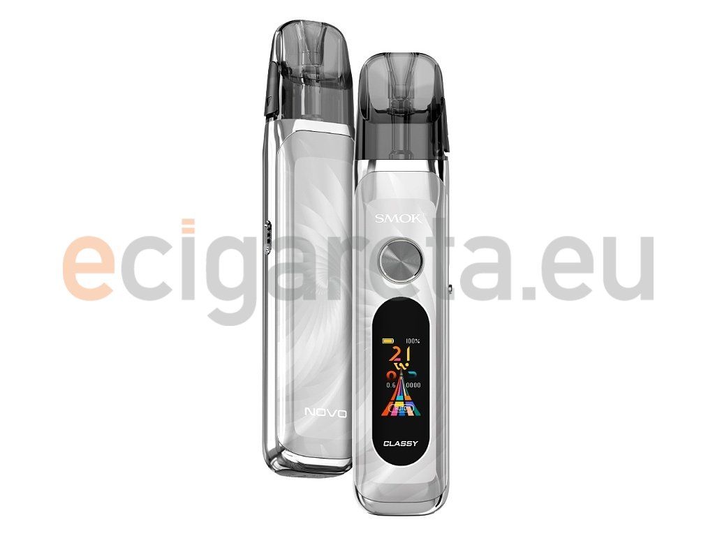 SMOK Novo Classy je kompaktní pod systém nové generace, který dokazuje, že elegance a výkon jdou ruku v ruce. Rám přístroje je vyroben ze slitiny zinku s texturovaným IML povrchem, do něhož jsou jemně vylisovány spirály zlatého řezu – výsledkem je zařízení, které se nejen skvěle drží v ruce, ale také na sebe okamžitě upozorní svým prémiový vzhledem. Přístroj pohání integrovaná baterie s kapacitou 1350 mAh, která zvládne pokrýt celodenní provoz bez nutnosti dobíjení. Maximální výstupní výkon dosahuje 35 W, přičemž o přehledné zobrazení stavu zařízení se stará barevný 0,96" TFT HD displej se šesti přizpůsobitelnými motivy uživatelského rozhraní. Disponibilní jsou dva inteligentní pracovní režimy: Auto mód pro automatické nastavení výkonu dle detekovaného odporu a Memory mód, který si pamatuje naposledy nastavenou wattáž. Součástí balení jsou dvě NOVO Pod CLX Cartridge o objemu 2 ml (EU verze) s meshovými žhavícími prvky 0,6 Ω a 0,8 Ω, vhodné pro styl potahování MTL i RDL. Plnění e-liquidu je řešeno praktickým topside systémem přímo na boku Pod Cartridge.