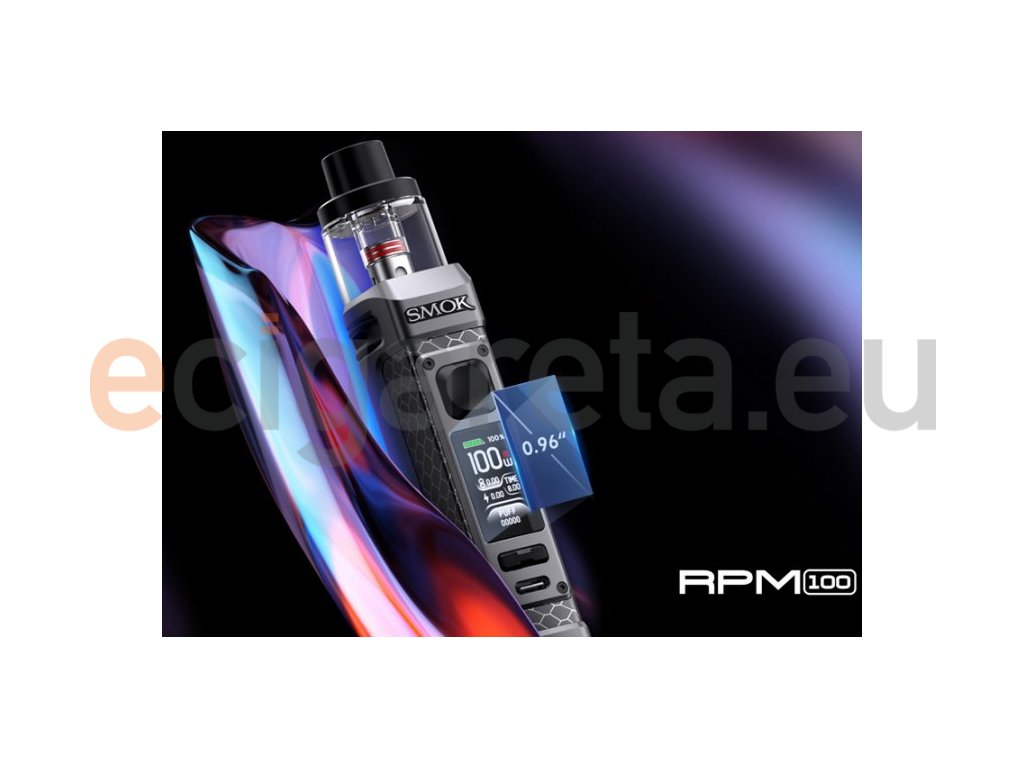 Smoktech RPM 100 je designově vyladěný grip technologií IML (In Mold Labeling) = vícevrstvá fólie zalitá plastem, opticky téměř nerozeznatelná od výrobků z pravého kovu, ovšem s výhodami plastu. Po vložení vyměnitelného monočlánku typu 21700/18650 Vás uvítá 0,96 palcový TFT displej, který umožňuje jednoduché nastavení hodnot a zobrazuje všechny potřebné informace. Nabíjení zajišťuje USB-C port. Mezi jeho další přednosti patří ochrana proti zkratu, přehřátí a podbití, či osmi vteřinová ochrana žhavení. Cartridge jsou vybaveny žhavícími hlavami RPM 3, které lze jednoduše vyměnit. Uživatelsky přívětivé vrchní plnění pojme až 6ml Vašeho oblíbeného liquidu. V základním balení budete mít na výběr dvě žhavící hlavy, a to Meshed o odporu 0,15ohm a 0,23ohm. Regulace přívodu vzduchu pro nastavení optimální kouřivosti se nachází ve vrchní části těla baterie.