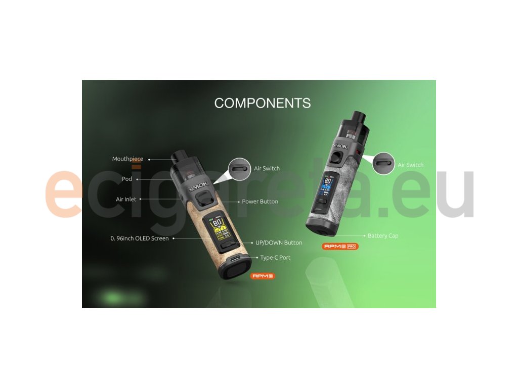 Smoktech RPM 5 je elegantně navržené speciální zařízení pro vapování, kombinující výhody POD systému a gripu s integrovanou baterií o kapacitě 2000mAh a nastavitelným výkonem až 80W. Zaoblené designové tělo zdobí 0,96 palcový TFT displej, který umožňuje jednoduché nastavení hodnot a zobrazuje všechny potřebné informace. Nabíjení zajišťuje USB-C port. Mezi jeho další přednosti patří ochrana proti zkratu, přehřátí a podbití, či osmi vteřinová ochrana žhavení. Cartridge jsou vybaveny novými žhavícími hlavami RPM 3, které lze jednoduše vyměnit. Uživatelsky přívětivé vrchní plnění pojme až 6,5ml Vašeho oblíbeného liquidu. V základním balení budete mít na výběr dvě žhavící hlavy, a to Meshed o odporu 0,15ohm a 0,23ohm. Regulace přívodu vzduchu pro nastavení optimální kouřivosti se nachází ve vrchní části.