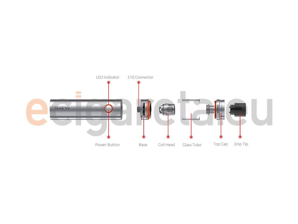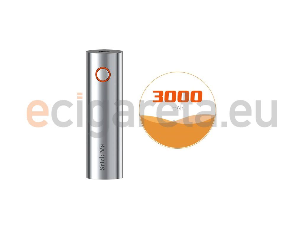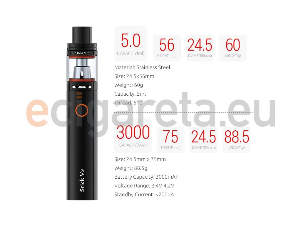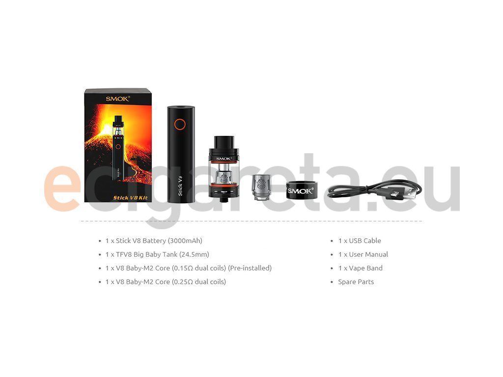 Smoktech Stick V8 se vyznačuje svojí jedinečnou kouřivostí a to díky propojení nové velkokapacitní baterie Stick V8 s clearomizerem TFV8 Big Baby. Vestavěná baterie o kapacitě 3000mAh s 20A vybíjecího proudu potěší i toho nejnáročnějšího uživatele. Nabíjení umožňuje micro USB vstup. Clearomizer TFV8 Big Baby vychází z původního modelu, avšak jeho kapacita narostla na úctyhodných 5ml. Využívá horní plnění bez jakéhokoliv šroubování...po pootočení horní části plníte otvorem přímo do těla clearomizeru (viz foto v příloze). Celý clearomizer je vyroben z nerez oceli a Pyrexu (laboratorní sklo). Regulace přívodu vzduchu se nachází v dolní části základny = ještě lepší kouřivost. Jako žhavicí hlavy využívá řadu V8 Baby, které Vás překvapí velkým výběrem odporů a počtem použitých spirálek. U této sady se navíc můžeme setkat s novou žhavicí hlavou M2 pro přímé potahování do plic.