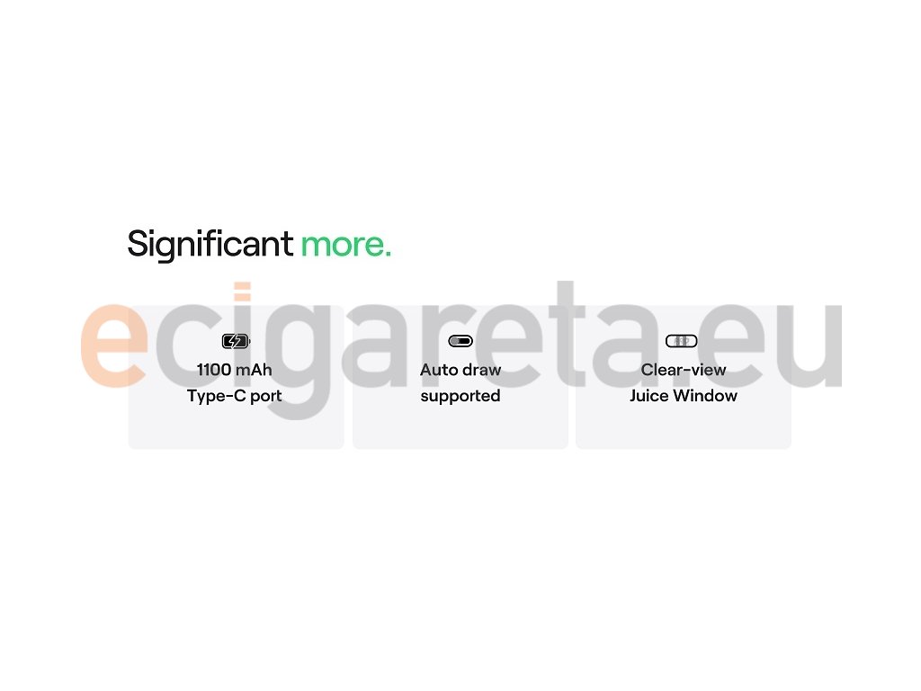 Parametry a specifikaceRozměry: 112,7 x 24,1 x 14 mm Kapacita baterie: 1100 mAh Režimy: Automatický režim VW Metody spínání potahu: Automatické Výstupní výkon: až 35W (automatický) Podporovaný odpor: dle cartridge Způsob nabíjení: USB-C port (5V / 1A) Regulace výkonu: Automatická Objem Pod Cartridge: 3 ml Styl potahování: MTL / RDL Odpor žhavících hlav v balení: 0,6 Ω Regulace přívodu vzduchu (Airflow): Ano Hmotnost: 46 g Barva: Light Silver (Stříbrná) Materiál: PC + PCTG |