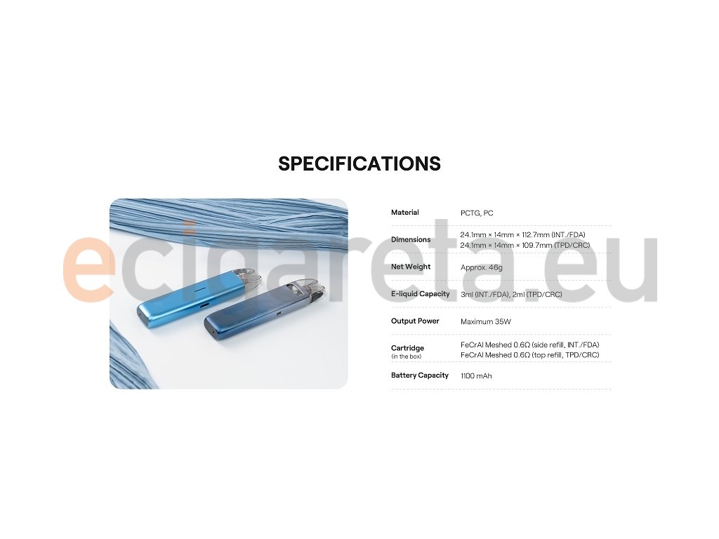 Parametry a specifikaceRozměry: 112,7 x 24,1 x 14 mm Kapacita baterie: 1100 mAh Režimy: Automatický režim VW Metody spínání potahu: Automatické Výstupní výkon: až 35W (automatický) Podporovaný odpor: dle cartridge Způsob nabíjení: USB-C port (5V / 1A) Regulace výkonu: Automatická Objem Pod Cartridge: 3 ml Styl potahování: MTL / RDL Odpor žhavících hlav v balení: 0,6 Ω Regulace přívodu vzduchu (Airflow): Ano Hmotnost: 46 g Barva: Slate Grey (Šedá) Materiál: PC + PCTG |