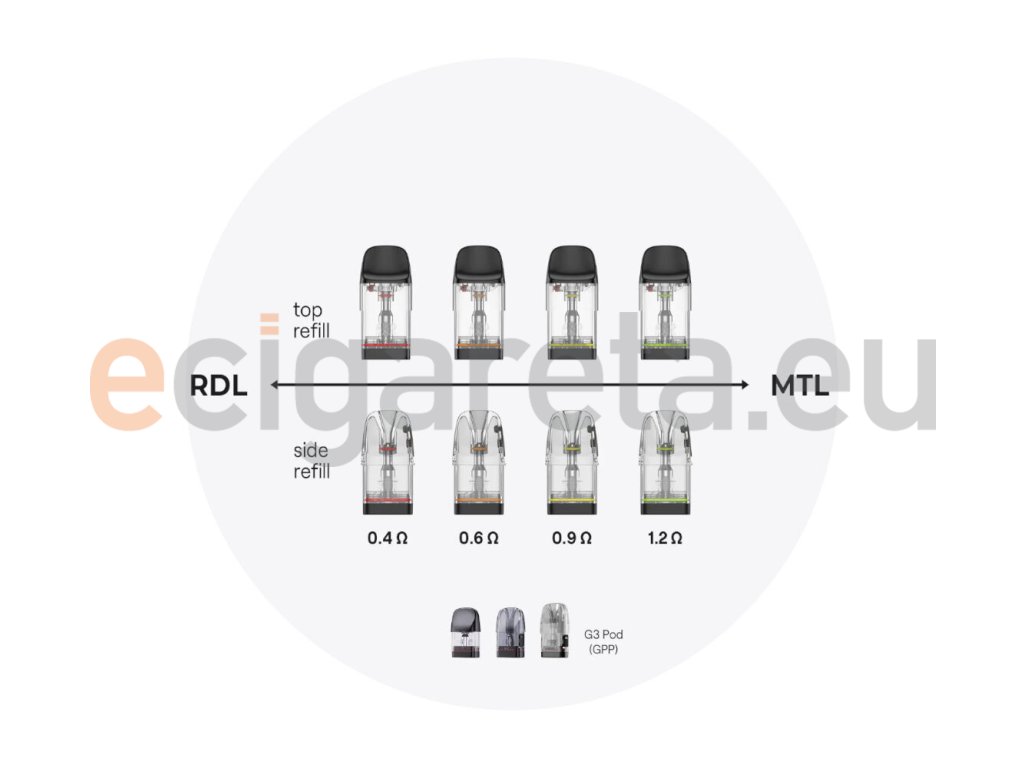 Moderní cartridge Caliburn GPP se přidávají ke stávající nabídce podů G3/G3 Pro a rozšiřují tak platformu kompatibilních zařízení. Na výběr máte z velkého množství podů pro různé styly vapování a s různými objemy. V základním balení najdete dvě cartridge GPP, první s odporem 0,4 Ω pro RDL a druhou s odporem 0,6 Ω pro MTL vapování.
