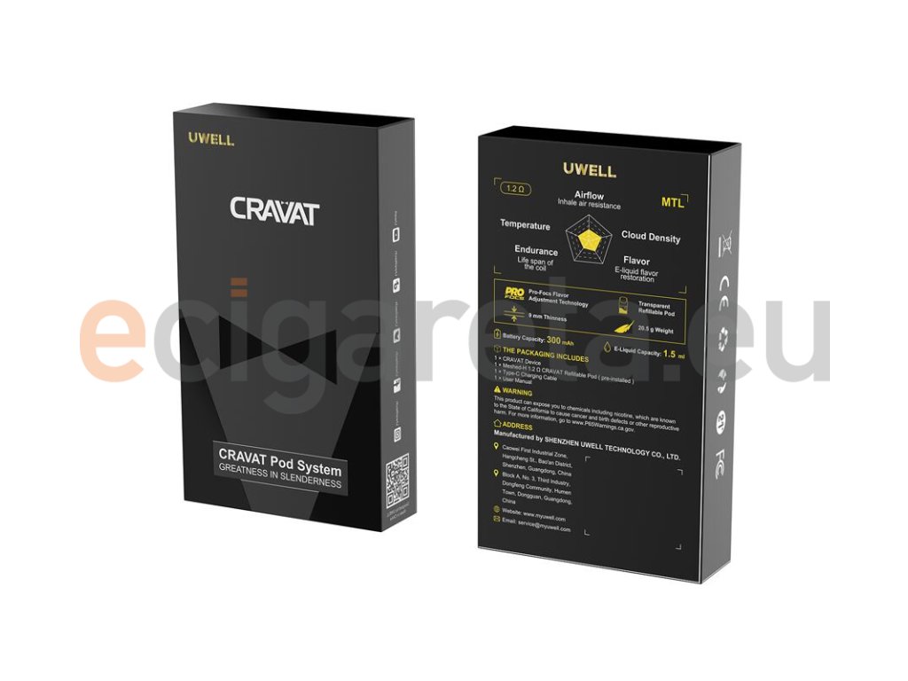 Uwell Cravat Pod Kit je elektronická cigareta zkonstruována pro zisk co nejvěrnějšího a nejlepšího podání chuti během potahu. Tělo je poháněno kvalitním elektronickým čipem, který rovnoměrně žhaví a dodává každému potahu správný říz. Samozřejmostí jsou potom cartridge vyrobené s pomocí technologie kvality chuti Pro-FOCS, kterou můžete znát i z řady dalších zařízení výrobce Uwell.
