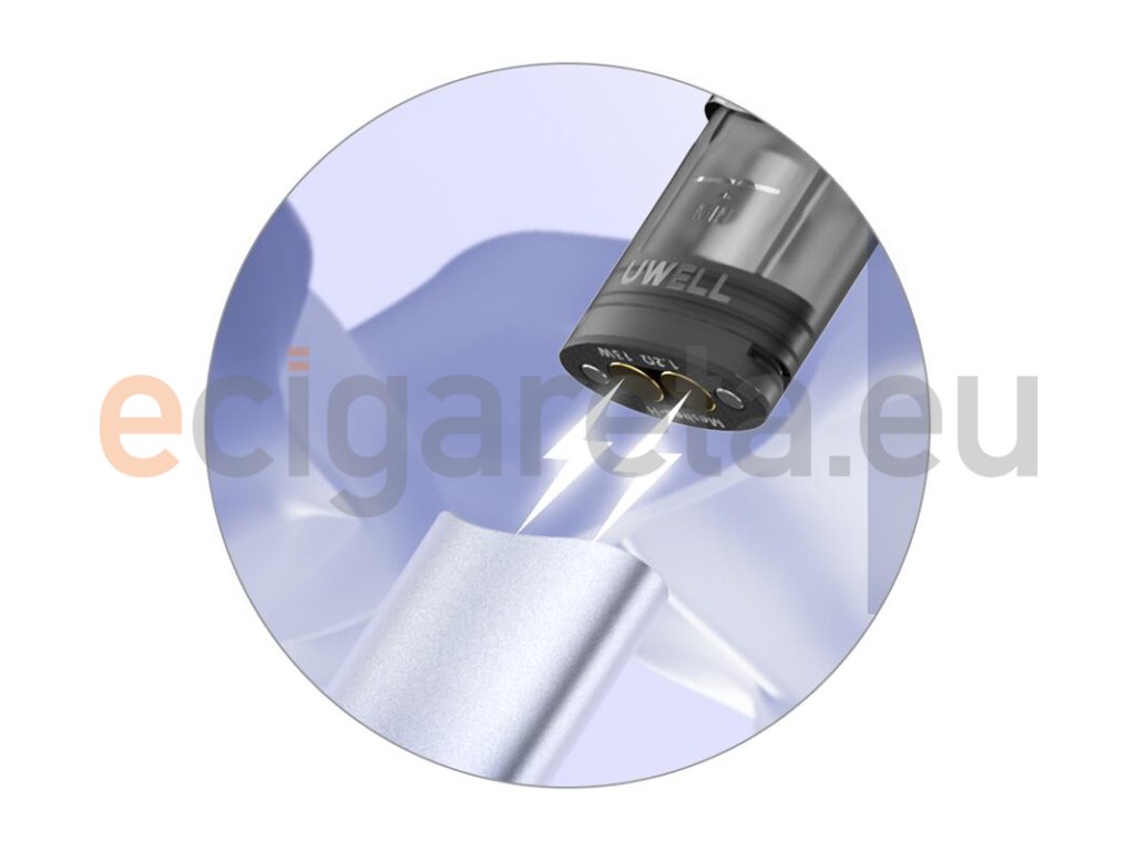 Ve vrchní části se nachází nová cartridge Uwell Kalmia. Cartridge disponuje objemem 1,6 ml a nabídne vynikající podání chuti díky integrovanému mesh tělísku FeCrAl UN2 Meshed-H s odporem 1,2 ohm. Dodá tak každému potahu věrné a prokreslené podání chuti, ale také optimální tuhost pro co nejlepší požitek z klasického šlukování.