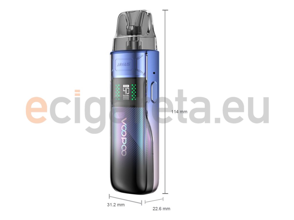 Není určeno pro náplně obsahující nikotin! Společnost VOOPOO si pro Vás připravila zbrusu nový model elektronické cigarety řady ARGUS s označením E40, která vás na první pohled zaujme svým futuristickým zpracováním. V ergonomickém těle baterie se nachází zabudovaný monočlánek o kapacitě 1800mAh s USB-C nabíjením. Přední panel baterie zdobí displej, který zobrazuje všechny potřebné informace o nastavení zařízení, včetně nastavitelného výkonu až 40W. Pro aktivaci baterie stačí pouze potáhnout z náustku nebo použít spínací tlačítko. Stejnojmenné cartridge o objemu 4,5ml s bočním plněním disponují odporem 0,3ohm a 0,6ohm. Pro dokonalé doladění chuti a kouřivosti poslouží boční Airflow.