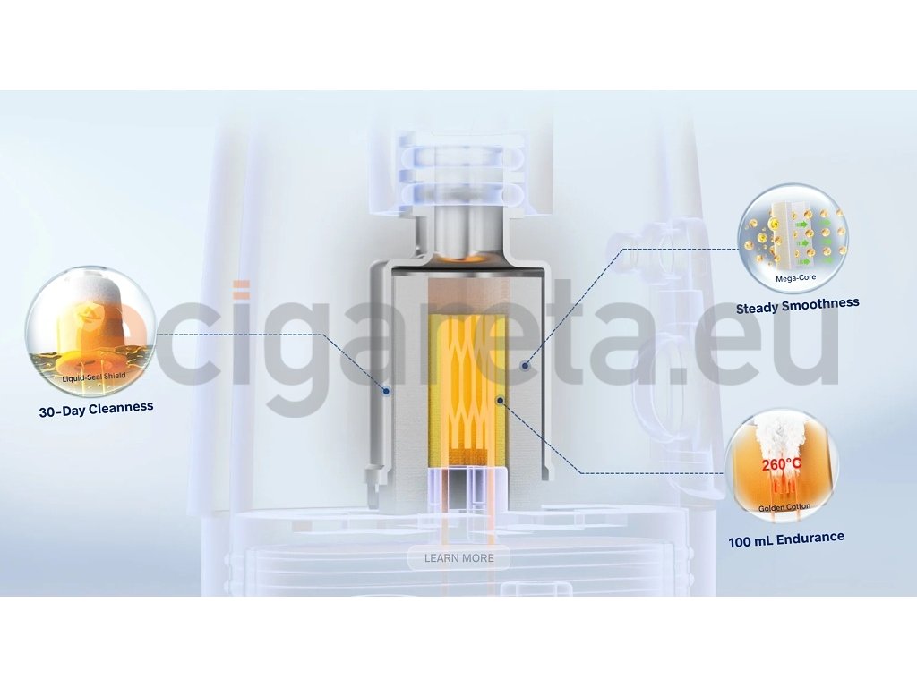 Výkonná baterieIntegrovaná lithium-iontová baterie s kapacitou 1350mAh poskytuje spolehlivou energii pro celodenní vapování. Vysoká kapacita baterie umožňuje stovky potahů na jedno nabití, zatímco pokročilé ochranné obvody zajišťují bezpečný provoz a dlouhou životnost baterie. |